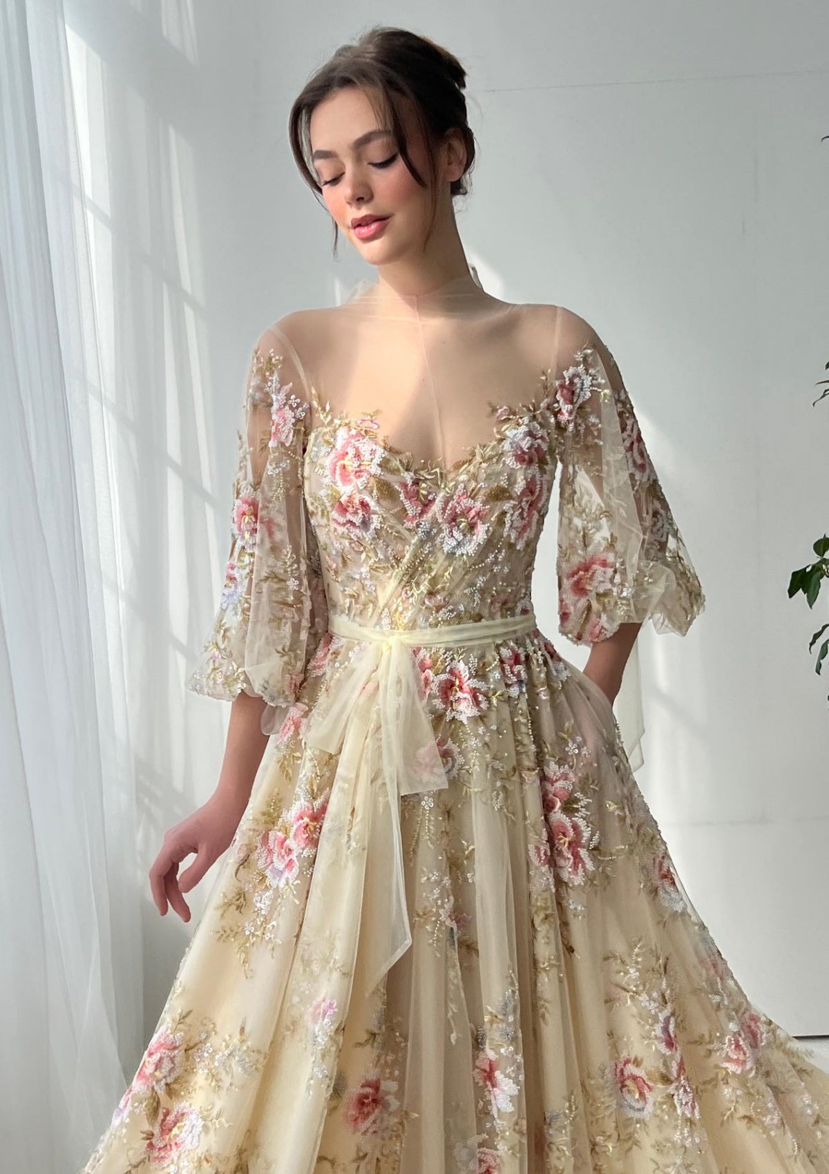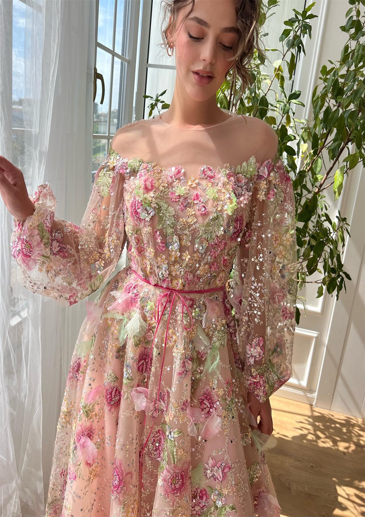 Illusion Scoop Neck Long Sleeves Floral Tulle Evening Dress