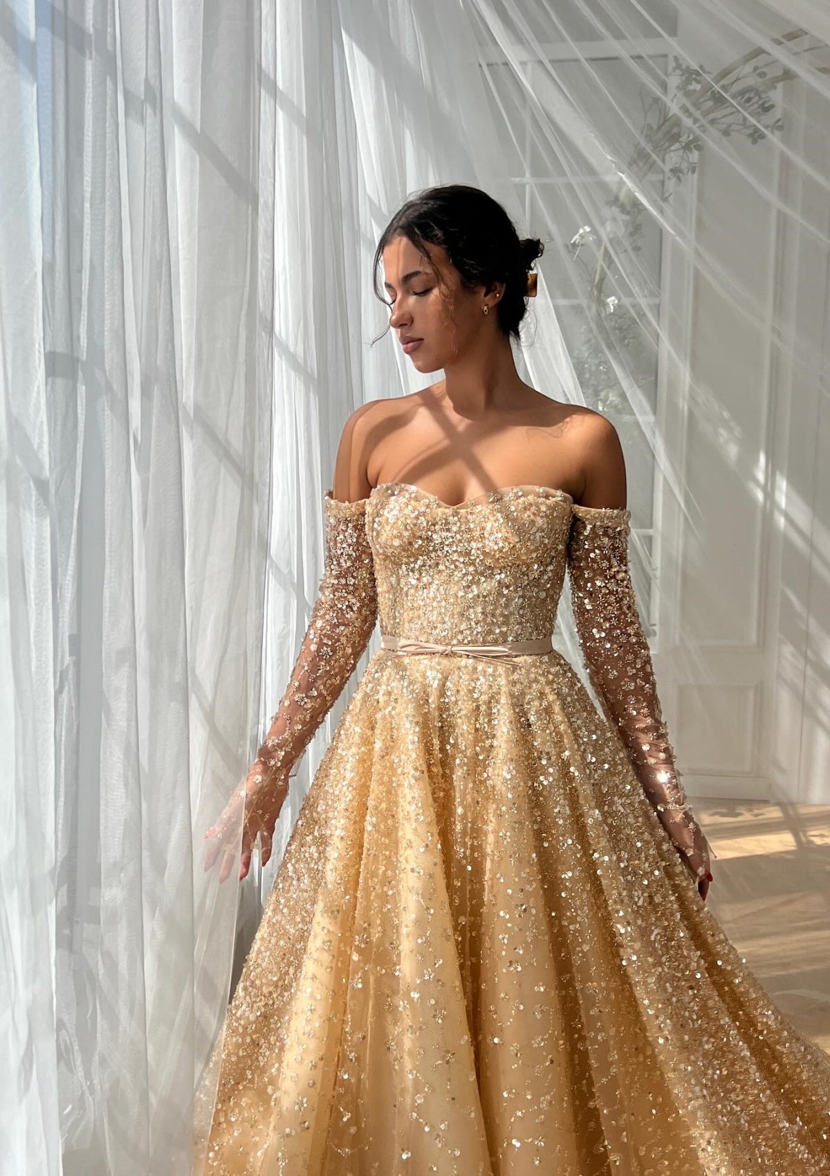 Luxury Sequin Long Sleeves Off-Shoulder Evening Gown