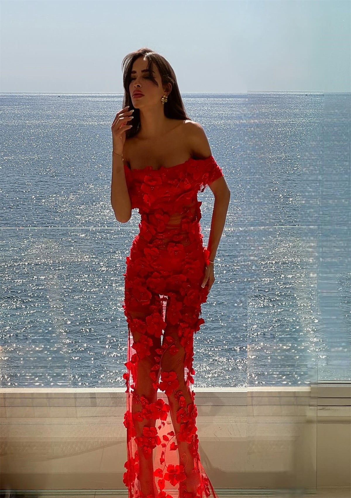Romantic Red Off-Shoulder Floral Sheer Maxi Evening Dress