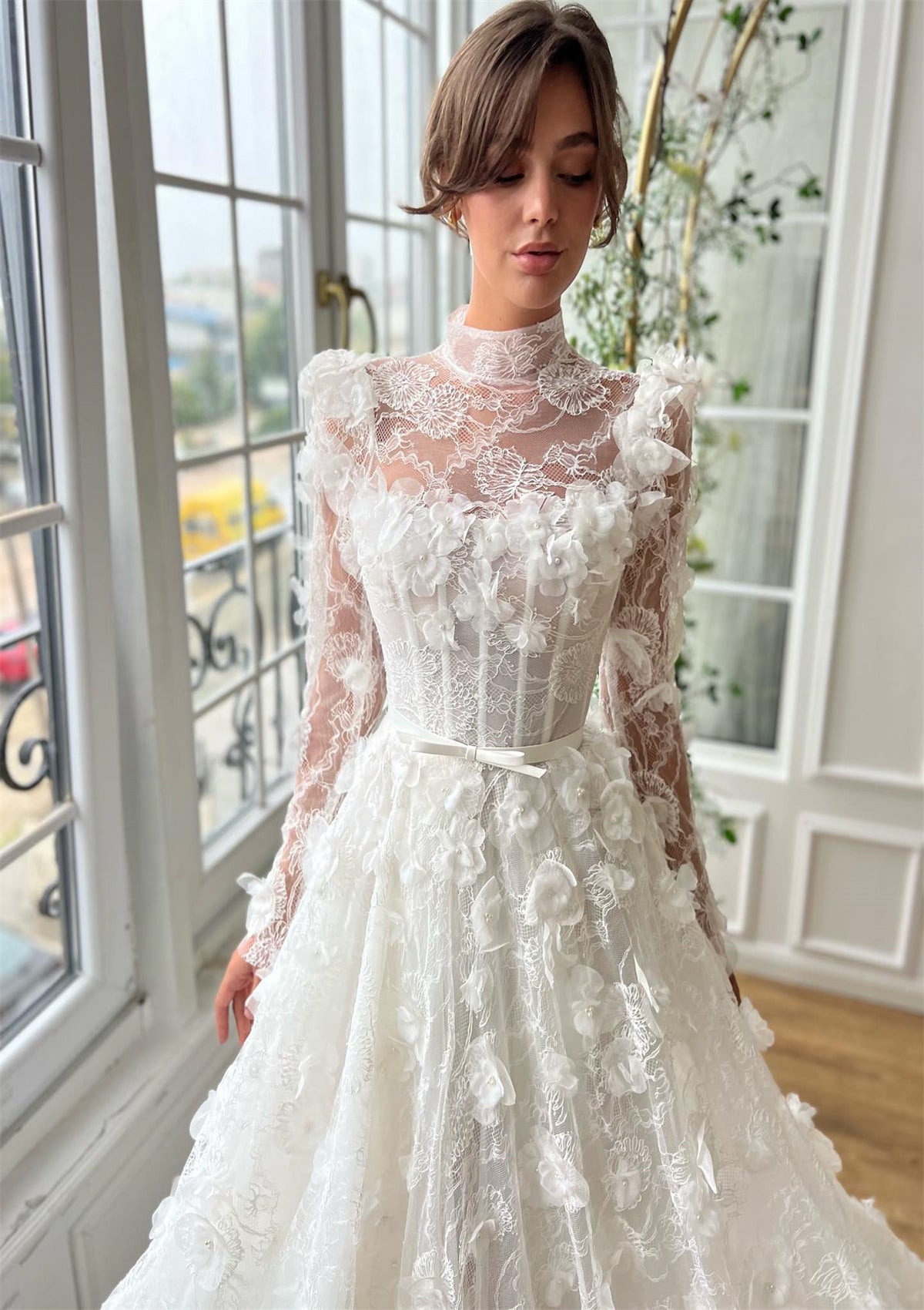 Luxury White 3D Floral Lace High-Neck Evening Dress with Long Sleeves