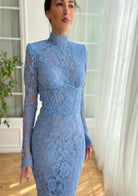 Elegant High Neck Handmade Floral Lace Evening Dress with Sleeves