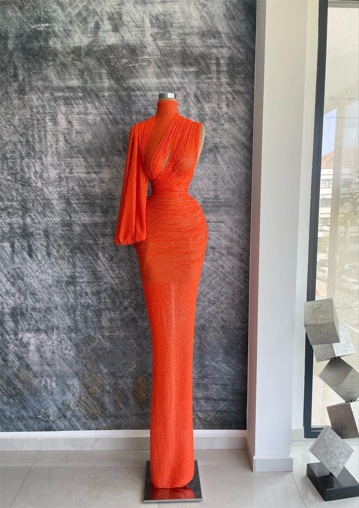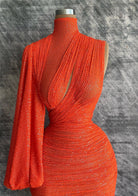 Glitter One-Shoulder High Neck Ruched Cutout Bodycon Evening Dress
