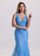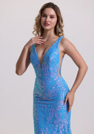 Illusion V Neck Sleeveless Sequin Evening Dress with Train
