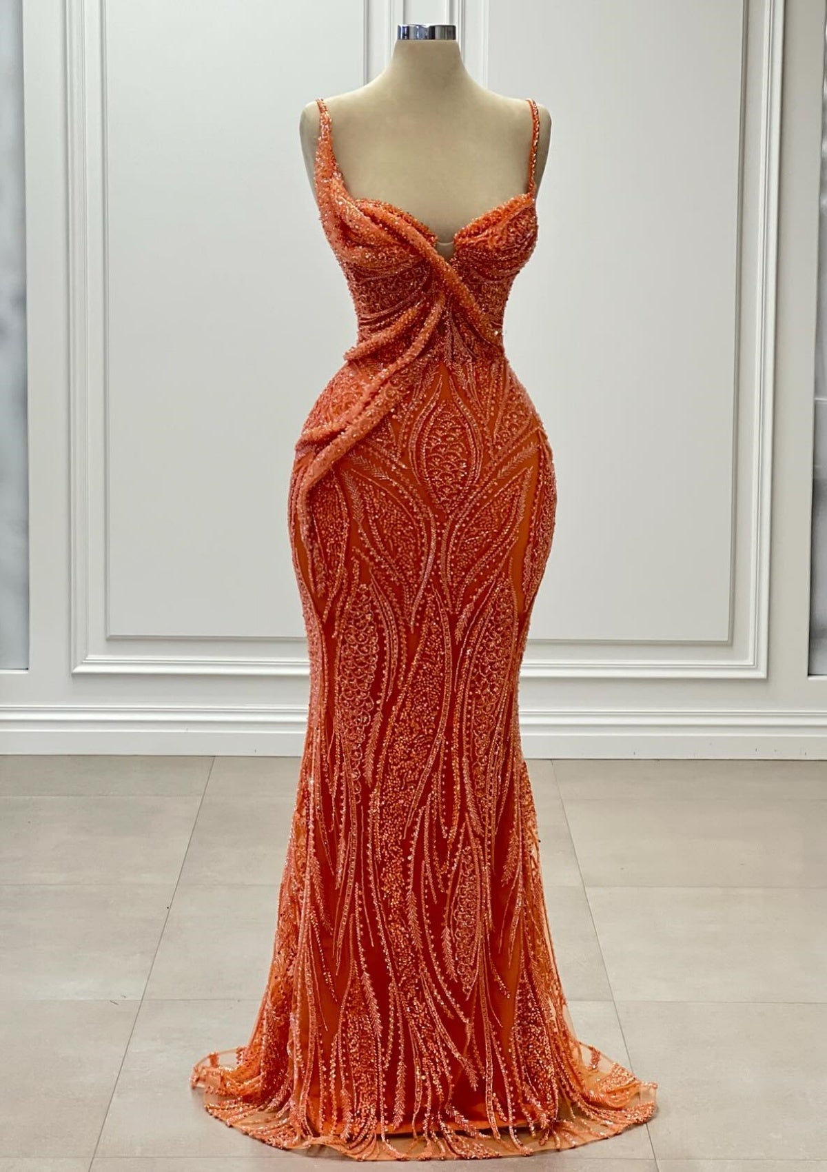 Column Spaghetti Strap Sequin Orange Long Prom Dress