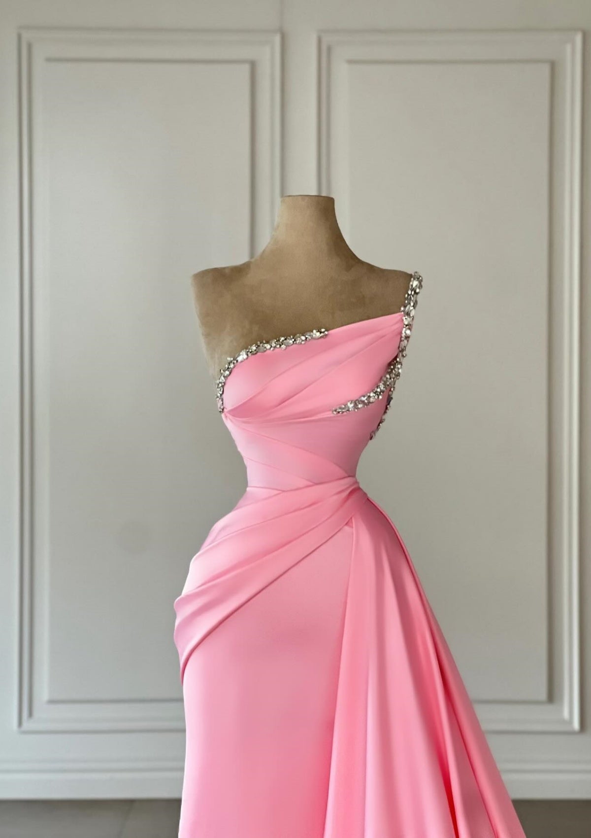 Designed One Spaghetti Strap Pleated Long Prom Dress