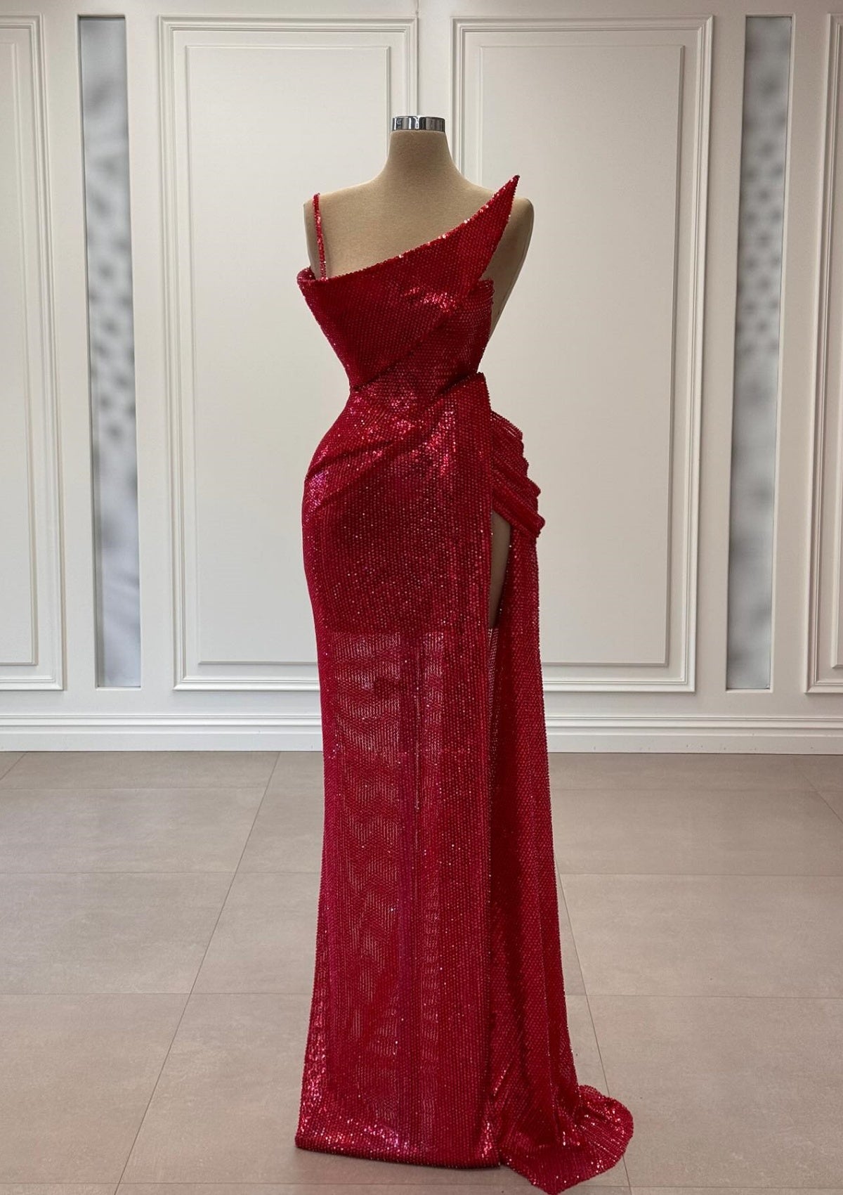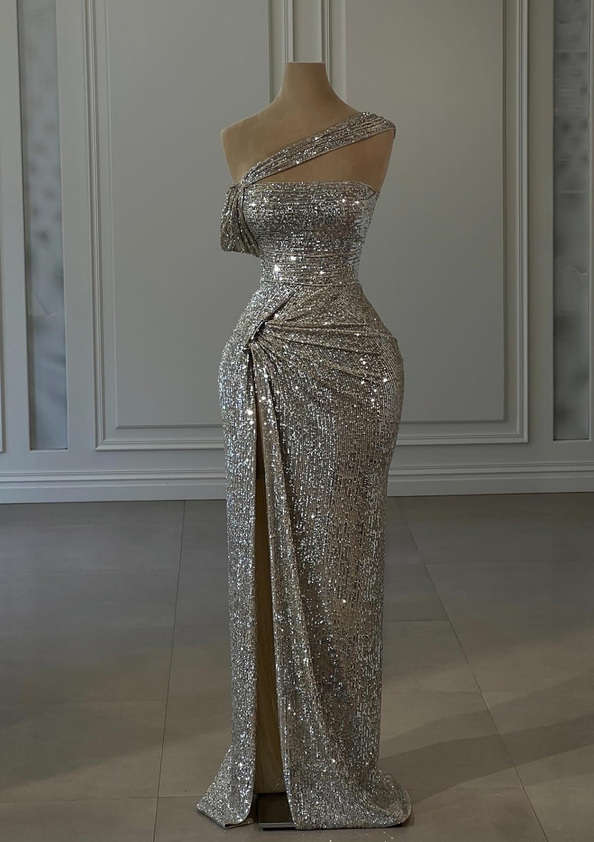 Column One Shoulder Sequin Cutout Prom Dress with Slit