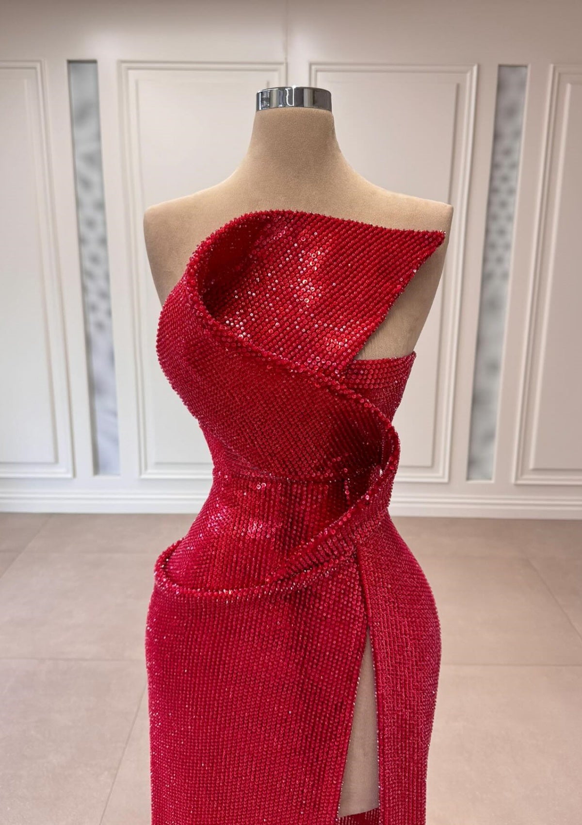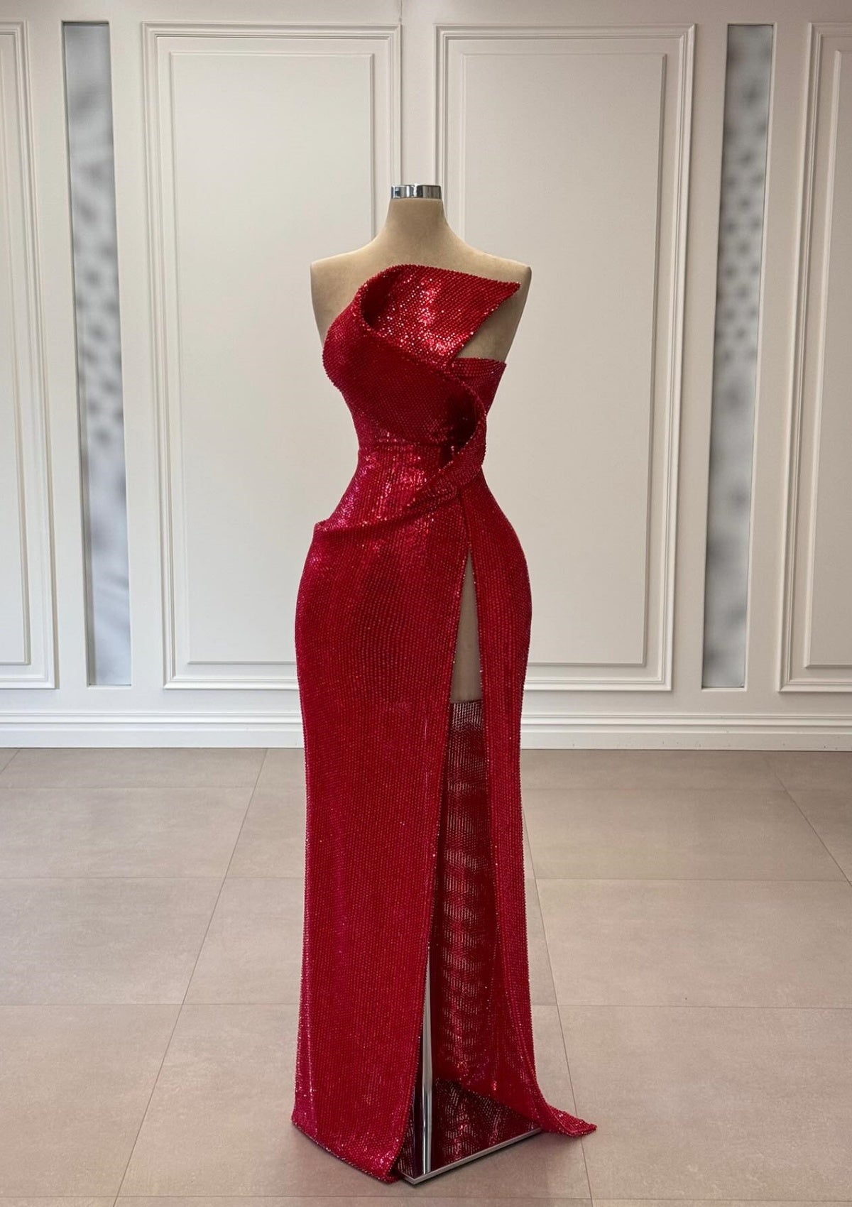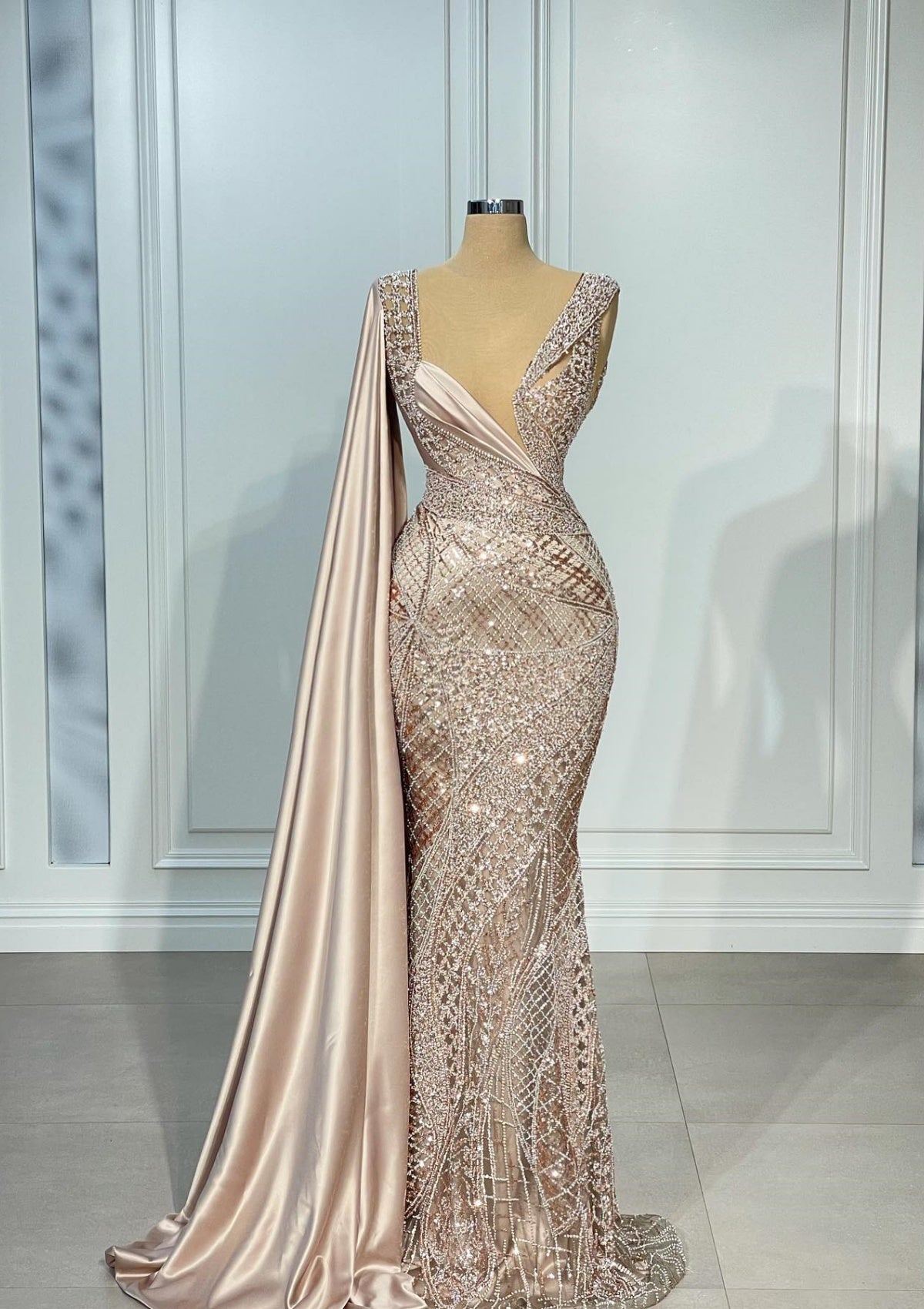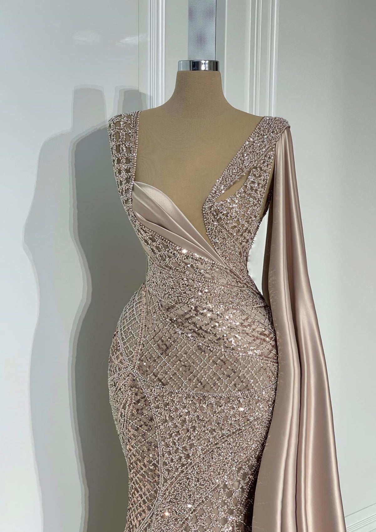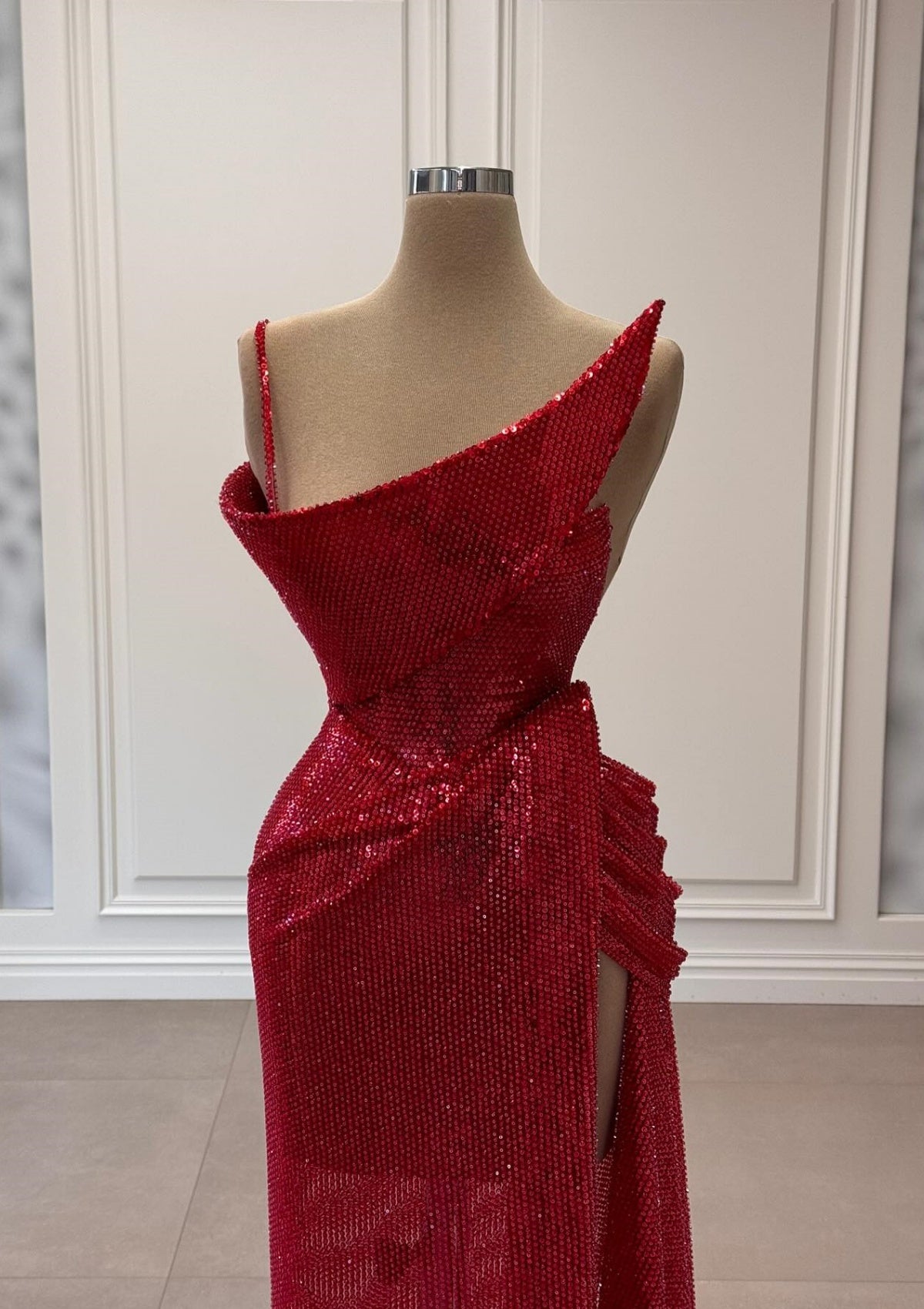 Designed Asymmetrical Neck Sequin Pleated Prom Dress