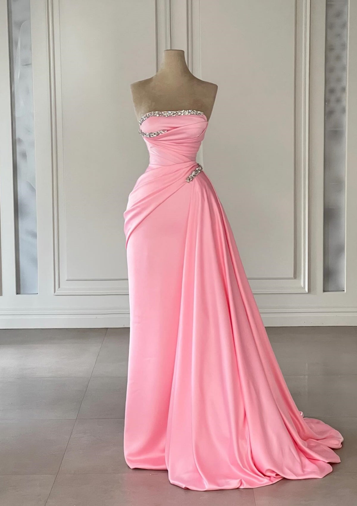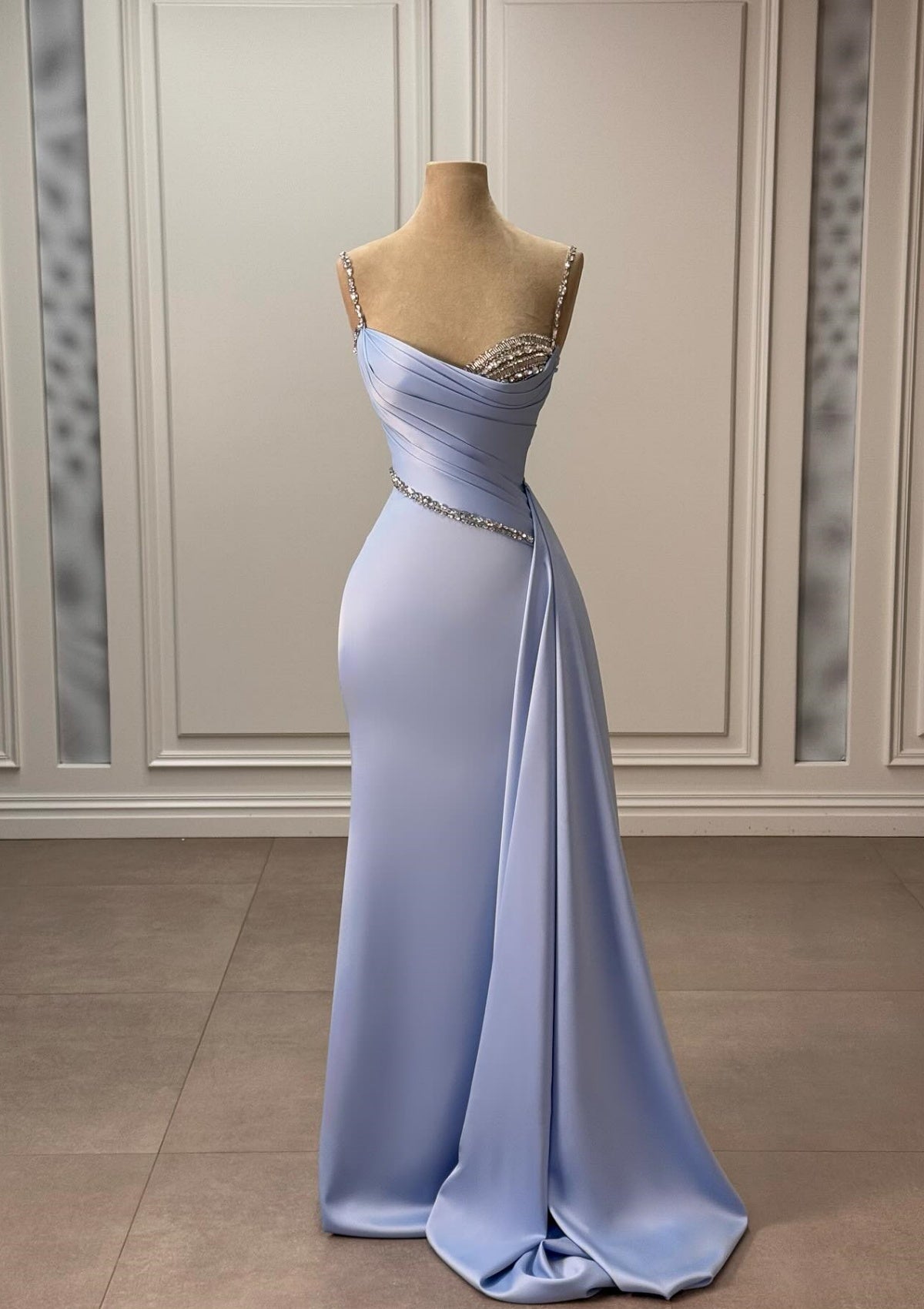 Elegant Spaghetti Strap Column Satin Prom Dress with Side Train