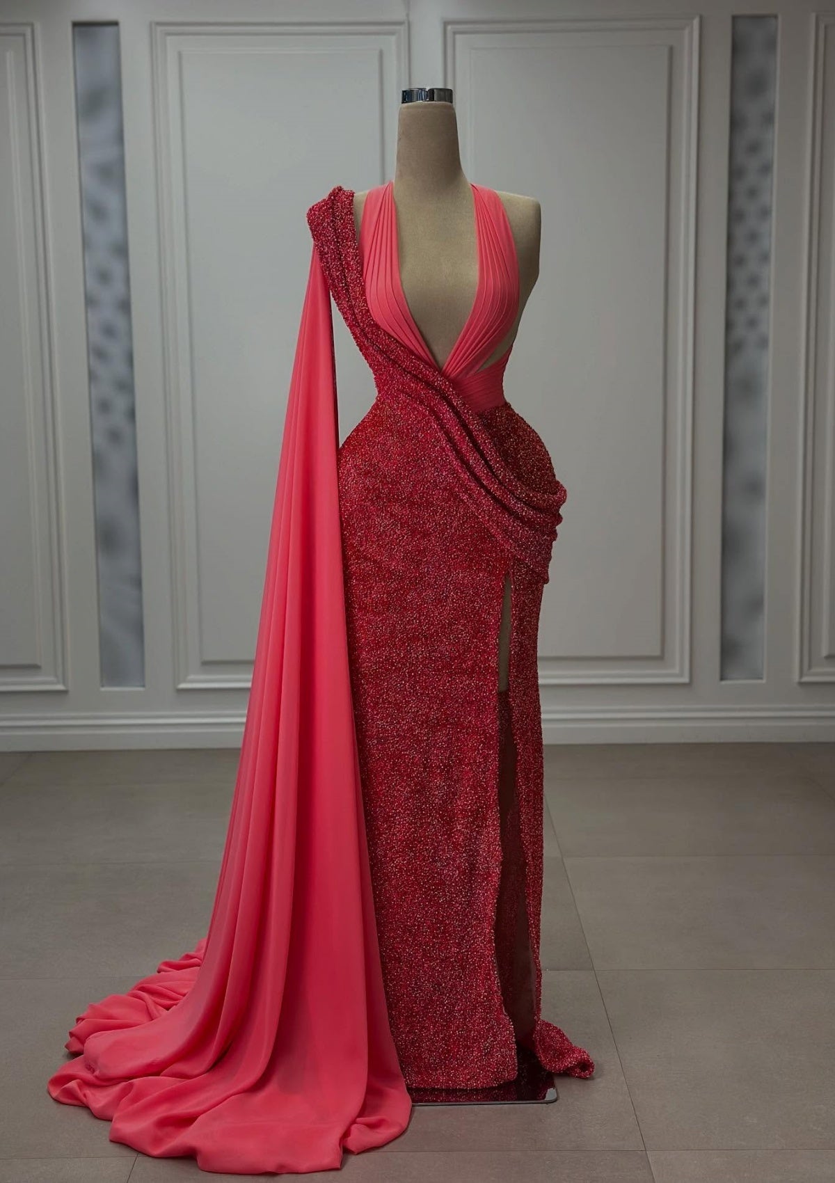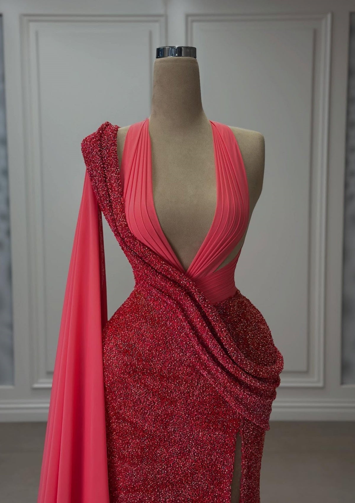 Elegant Halter Plunging Neck Beading Red Prom Dress