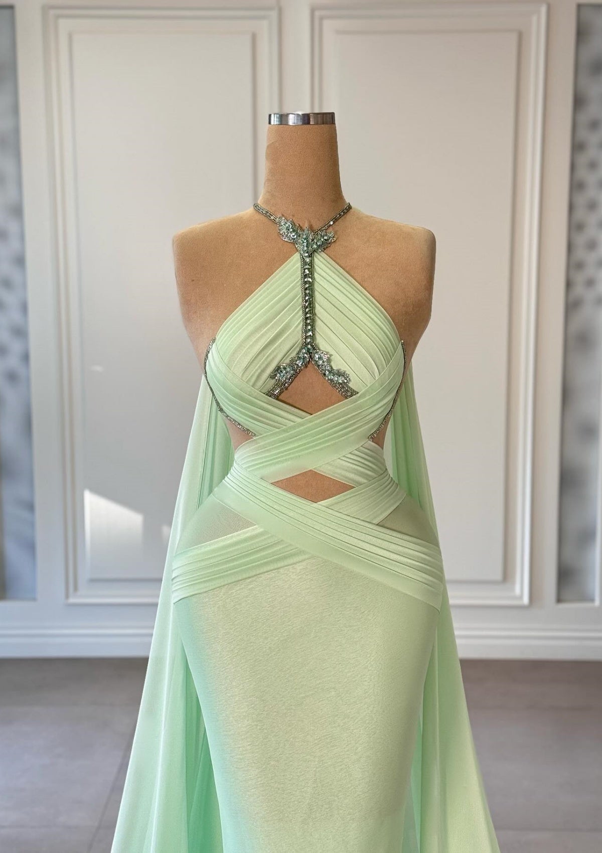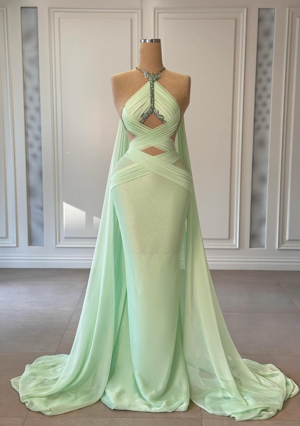 Elegant Mint Green Cross Halter Cutout Evening Dress with Train