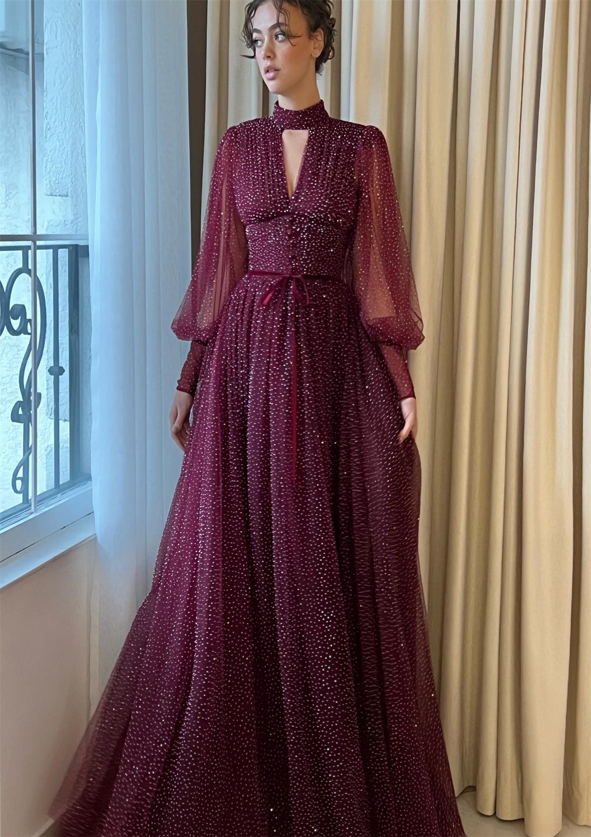 Elegant Long Sleeves Cut Out Sequin Tulle Evening Dress