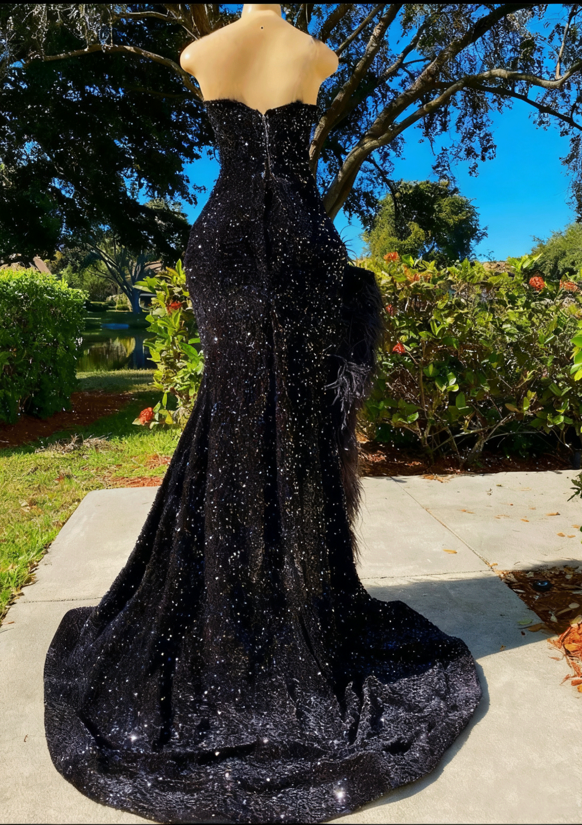 Mermaid Beaded Deep V Neck Feather Detail Evening Gown