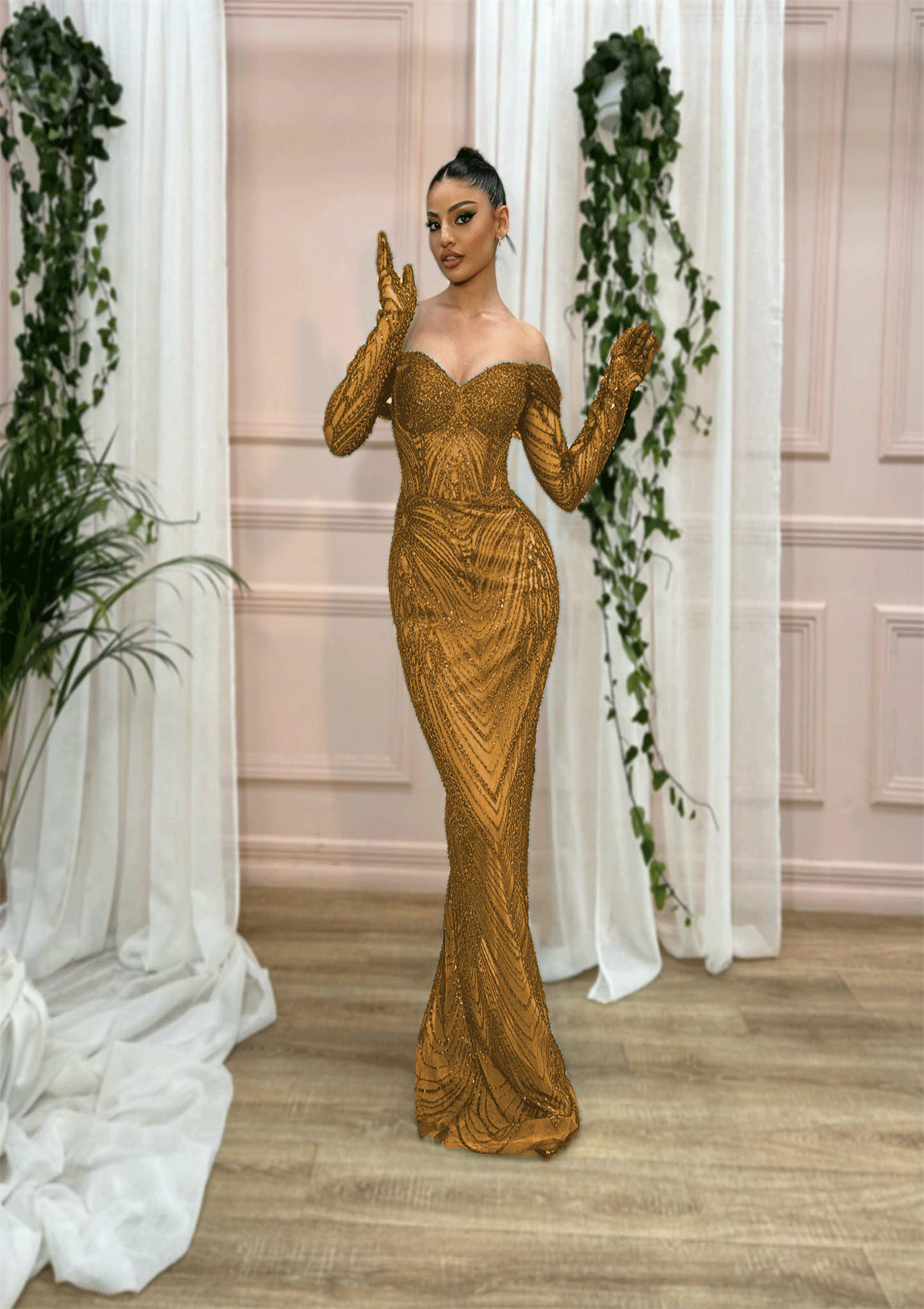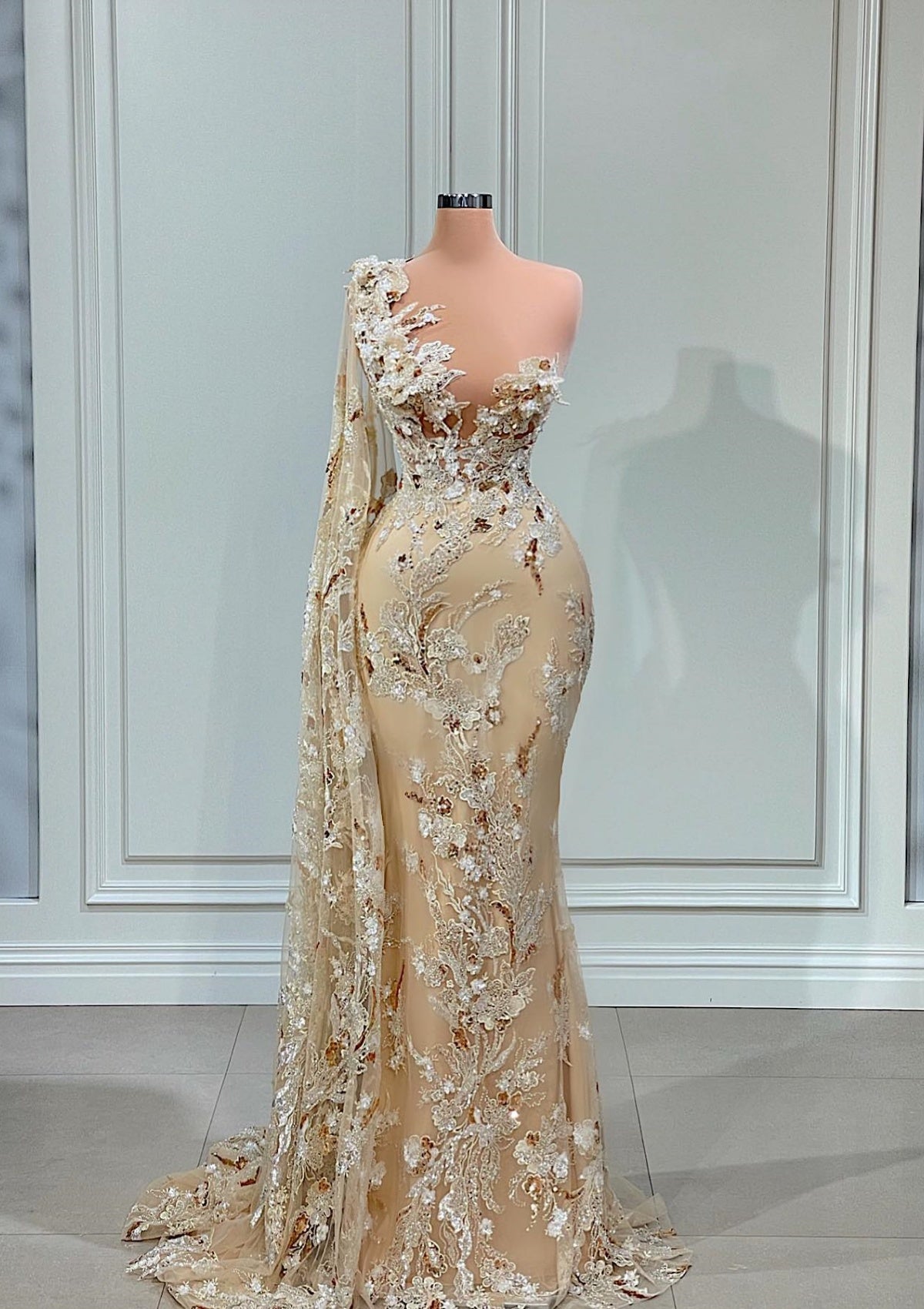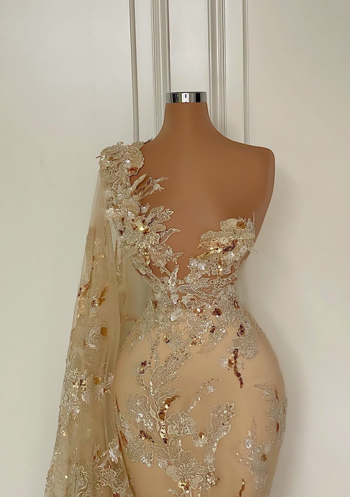 Mermaid Sequin Appliques Champagne Evening Dress with Draped Sleeves