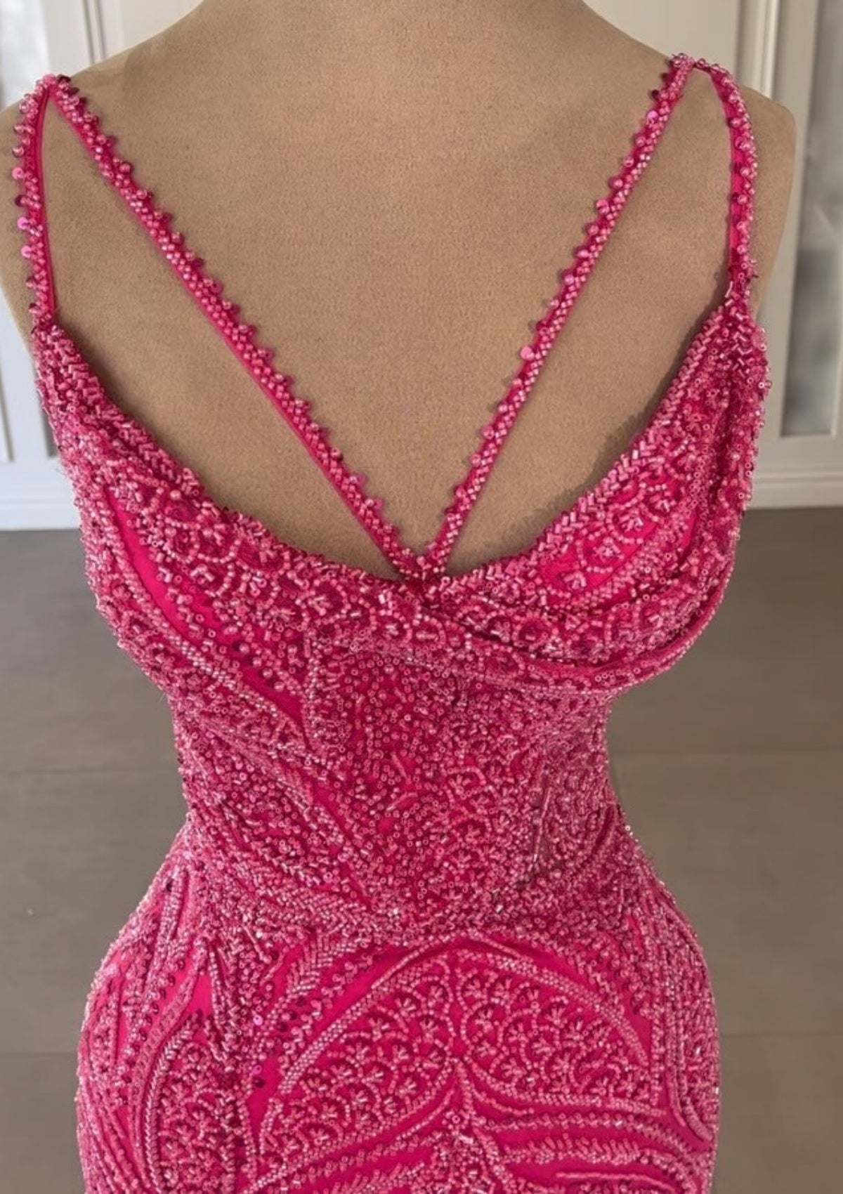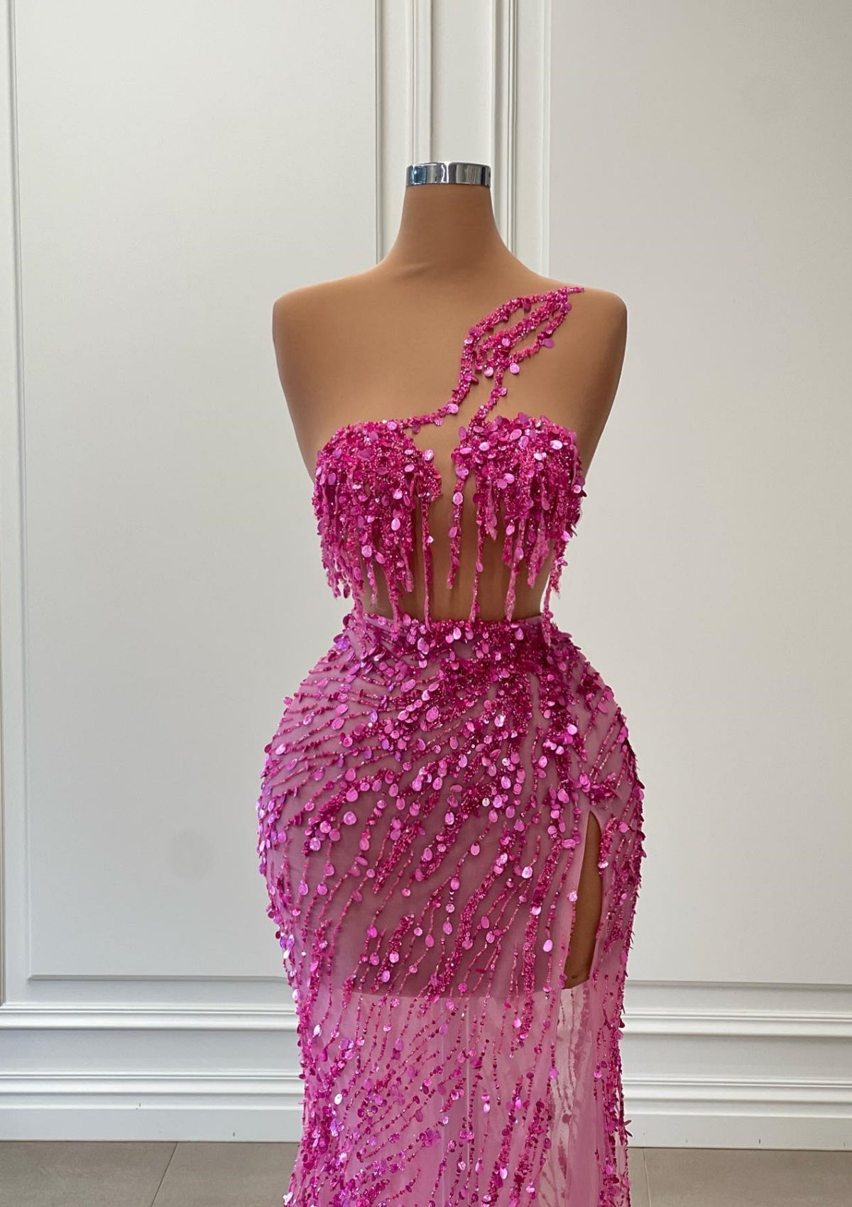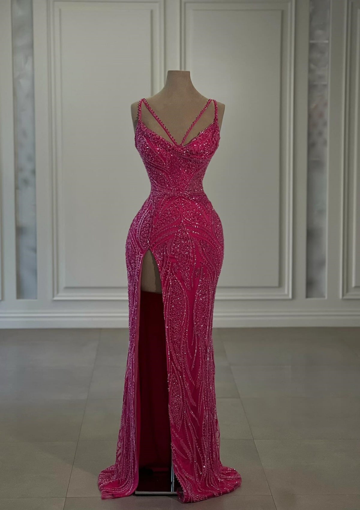 Sexy Sparkly Beadings Fuchsia Prom Dress with Slit