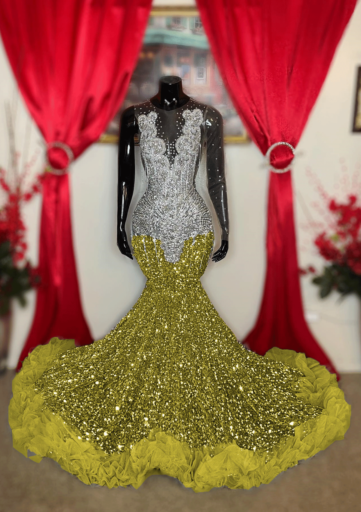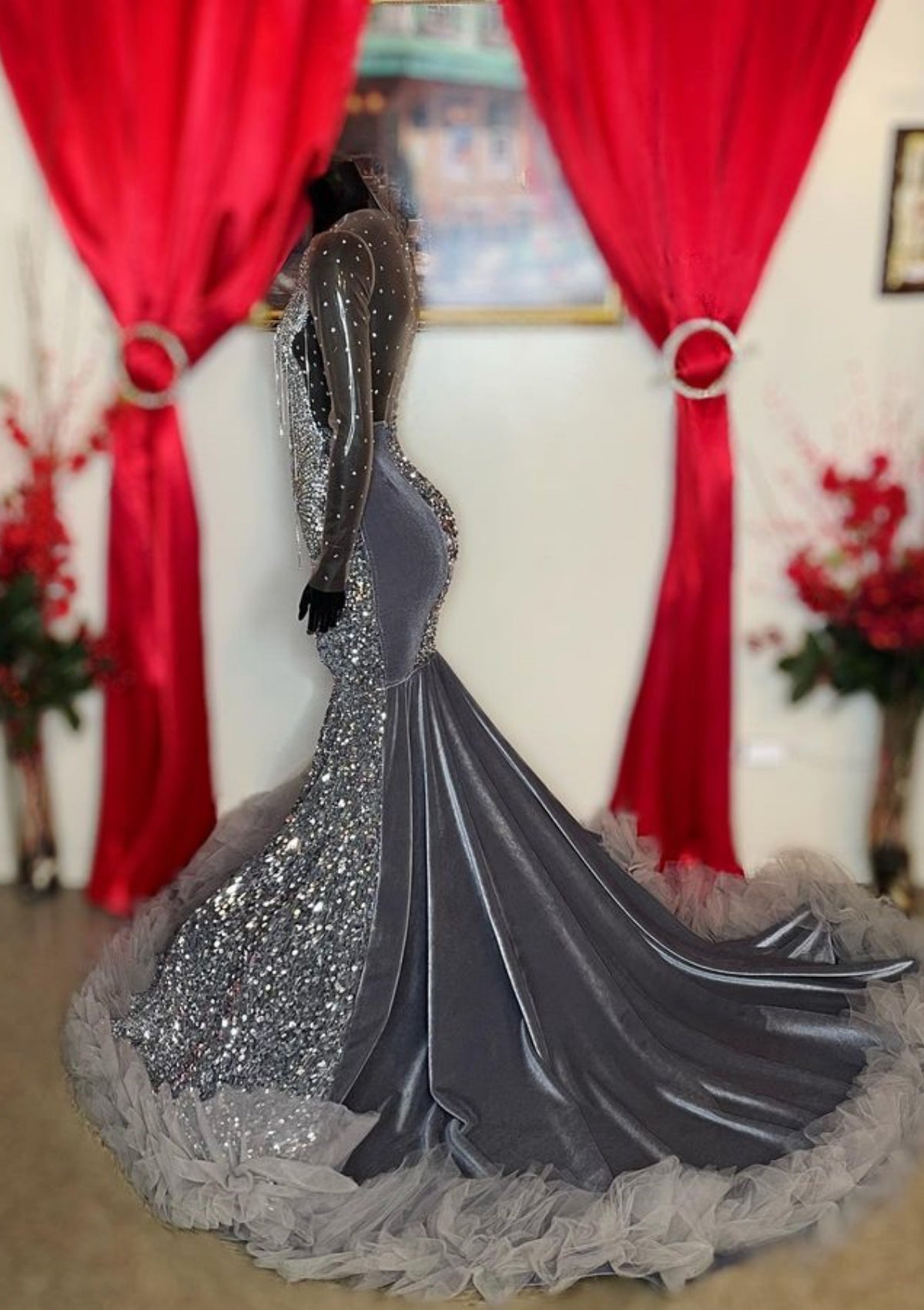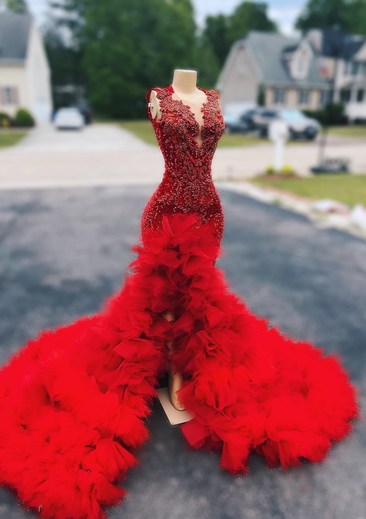 Sex Beaded Cutout Prom Dress with Flowing Ruffled Train