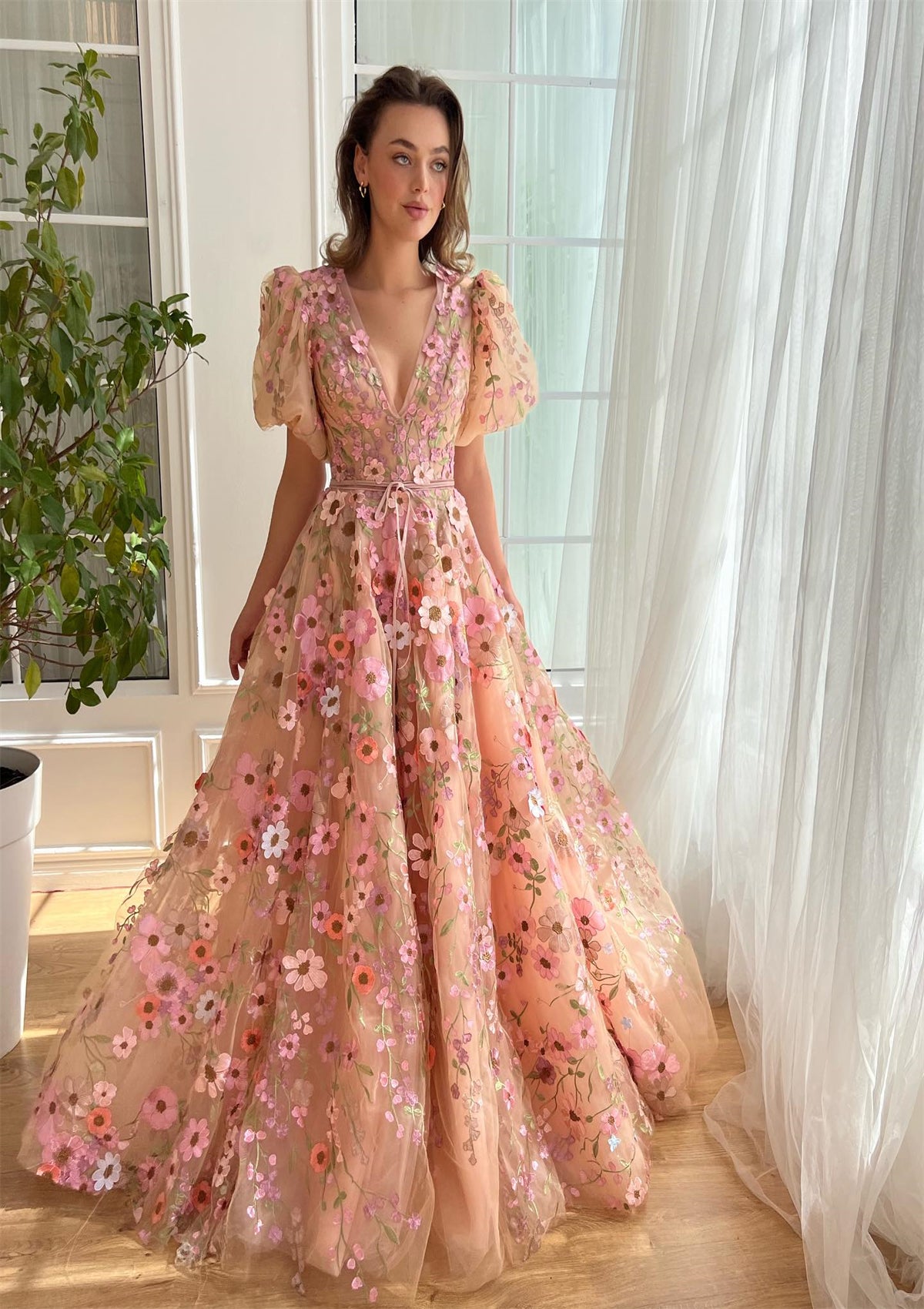 Sweet Puffy Sleeves 3D Floral Tulle Prom Dress with Bow
