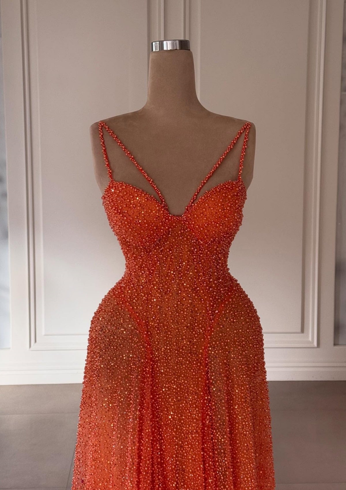 A Line Heavy Embellished Beading Long Orange Prom Dress