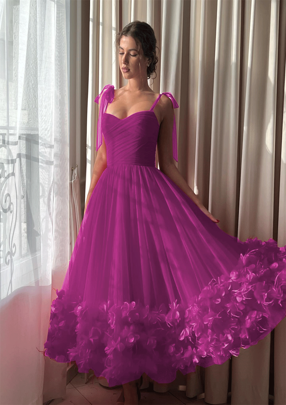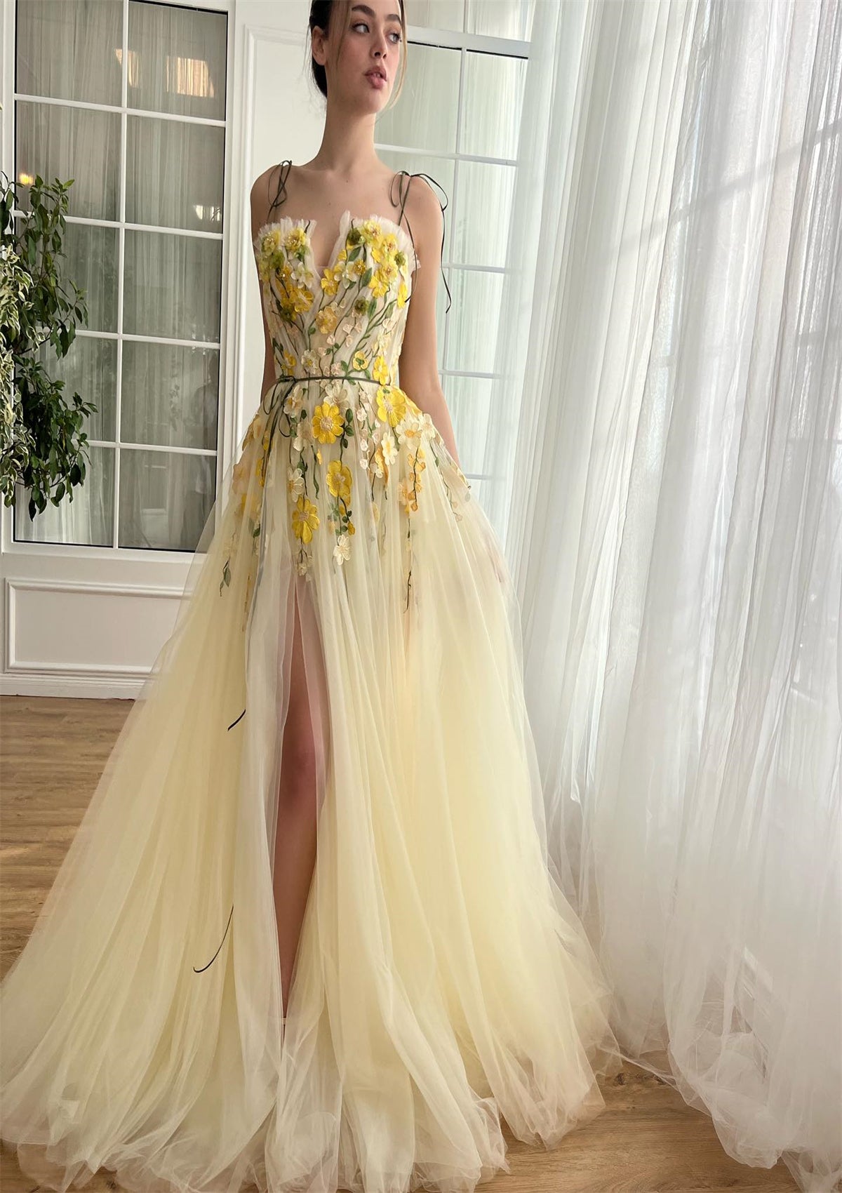 Classic Spaghetti Strap Layered 3D F lowers Prom Dress