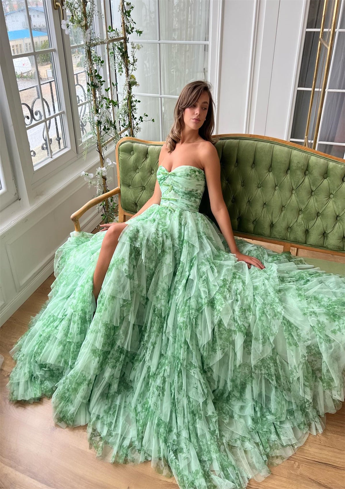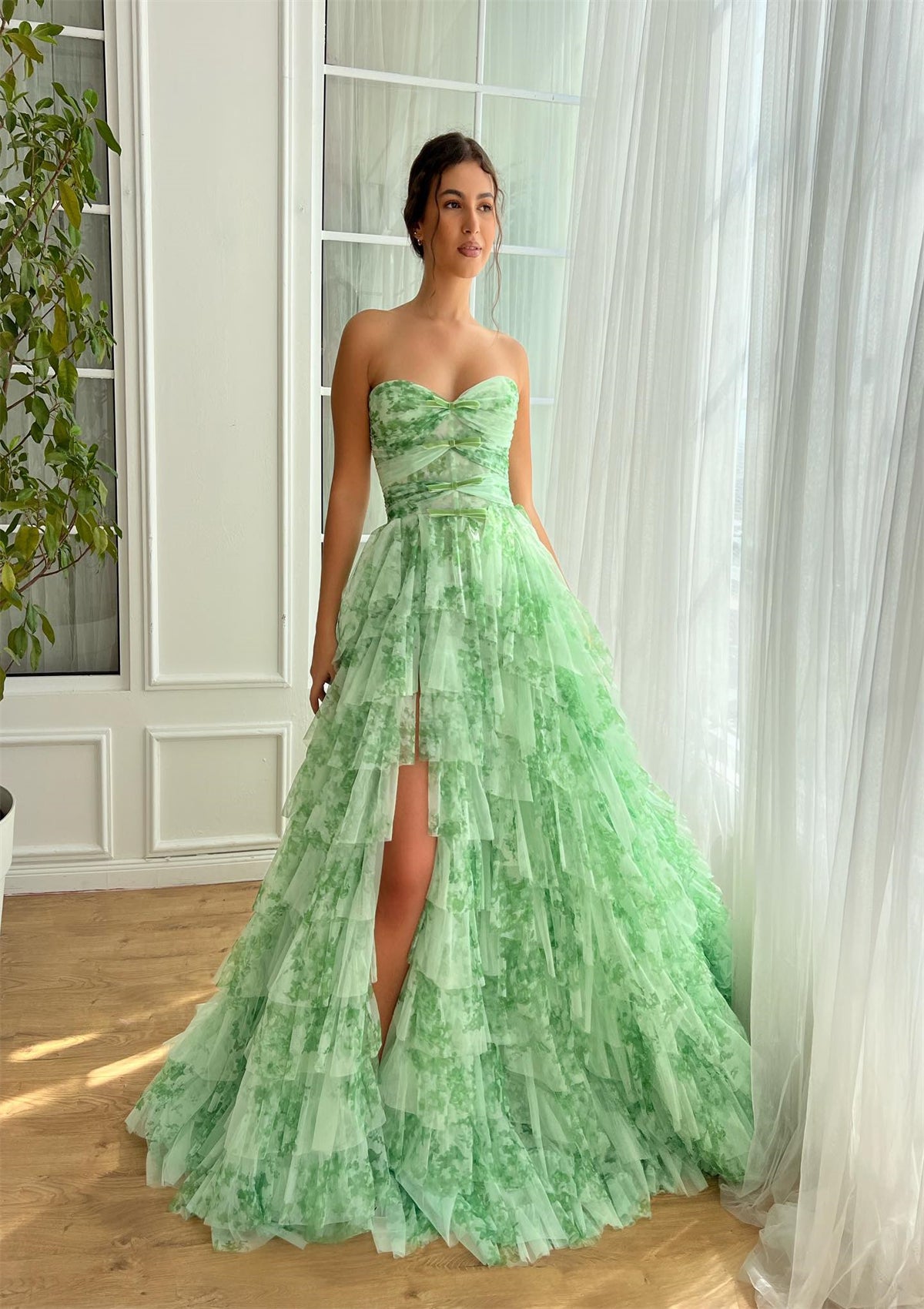 A Line Sweetheart Layered Printed Prom Dress with Slit