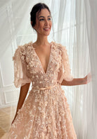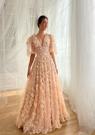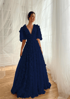 Elegant V Neck Short Sleeves 3D Flowers Evening Dress