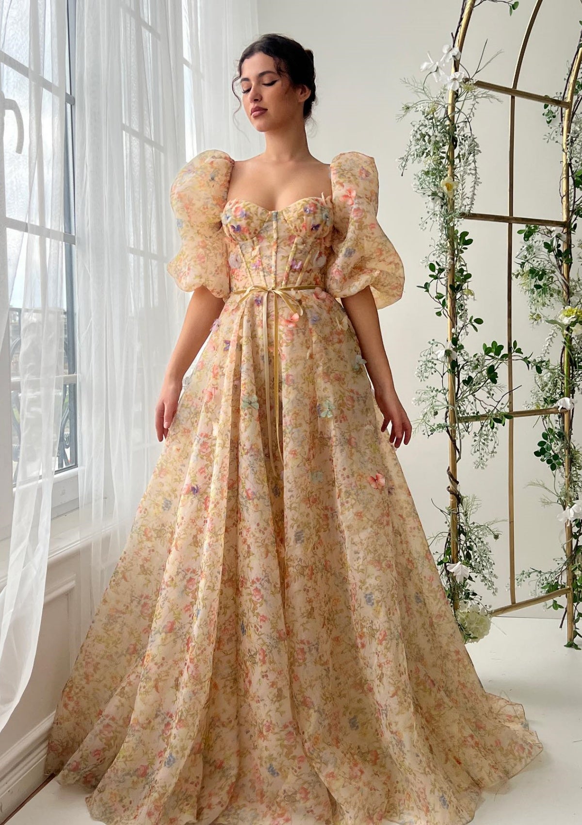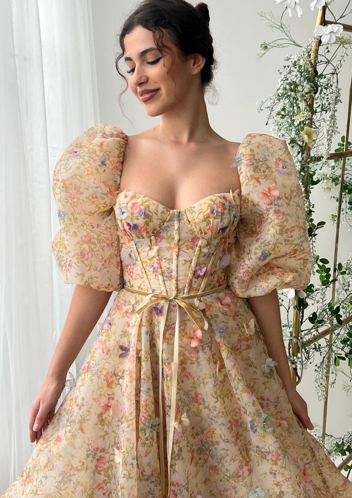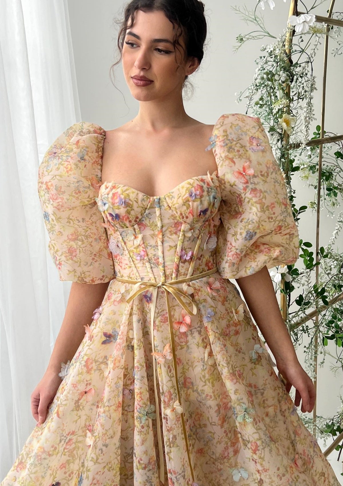 Glamorous Print Floral Puffy Sleeve Evening Dress with 3D Butterfly