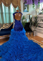 Glamorous Rhinestone Fringe Cutout Prom Dress with Flowing Ruffled Train