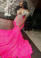 Glamorous Rhinestone Off Shoulder Cutout Evening Dress with Flowing Train