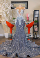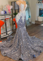 Glamorous Sequined Rhinestone Cutout Evening Dress with Flowing Train