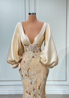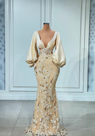 Gorgeous Plunging Neck Sequin Appliques Evening Dress with Puffy Sleeves