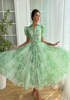 Green Short Sleeves V Neck Midi Printed Prom Dress