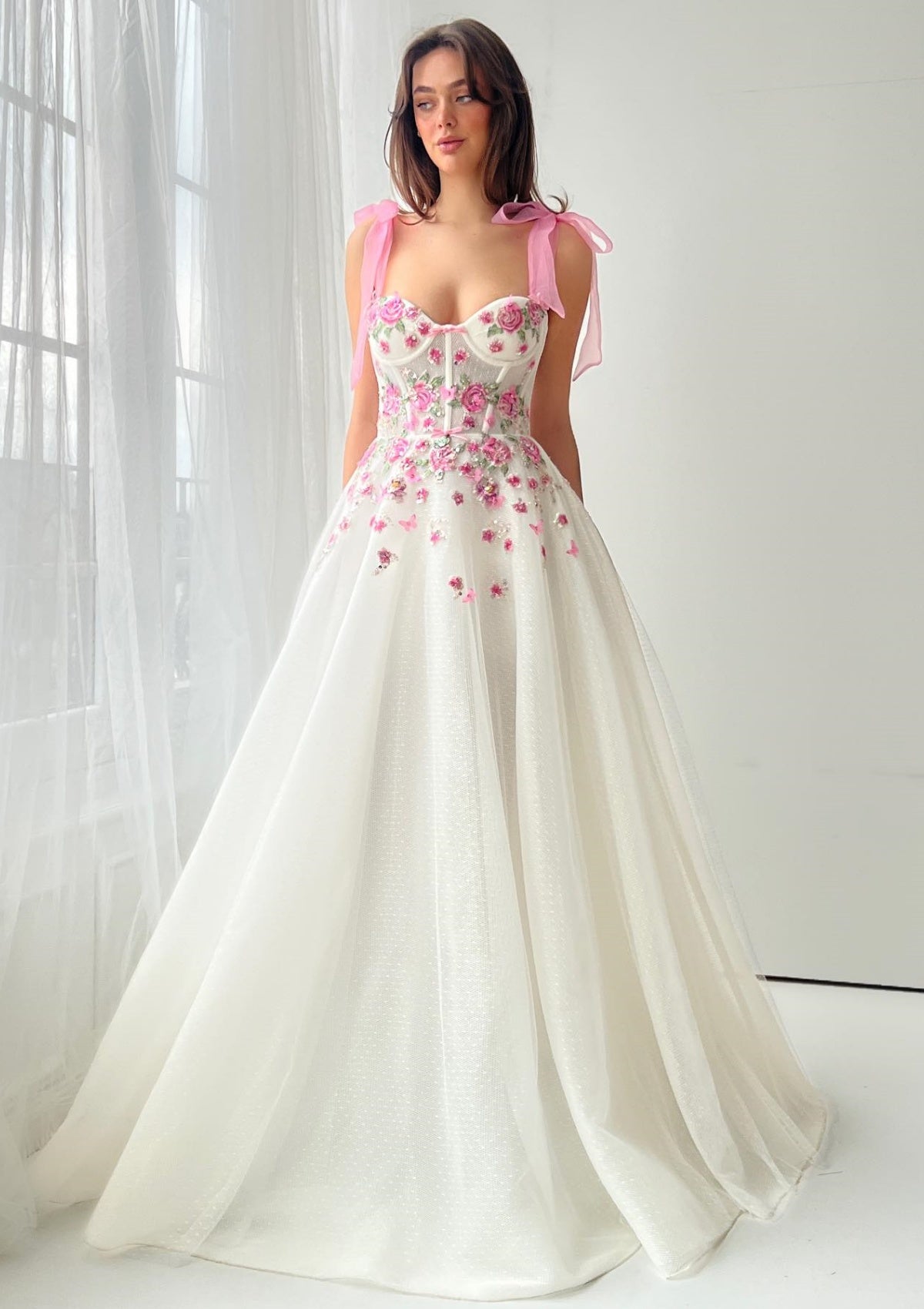 Ivory Floral Embroidered Evening Gown with Pink Ribbon Straps