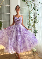 Lavender Floral Tulle Midi Dress Sweet Spaghetti Strap Prom Dress
