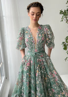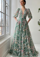 Luxury Floral Embroidered Puff Sleeves Tulle Evening Gown Train