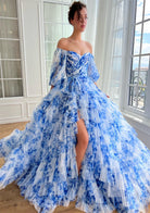 Luxury Off-Shoulder Puff-Sleeve Blue Floral Print Tulle Prom Dress