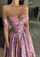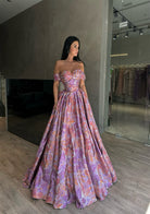 Luxury Off-Shoulder Sweetheart Handmade Printed Satin Prom Dress