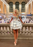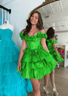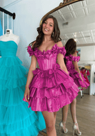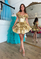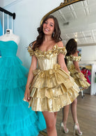 Metallic Off Shoulder Corset Tiered Homecoming Dress