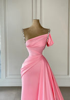 Pink One Off Shoulder Long Evening Dress with Rhinestone