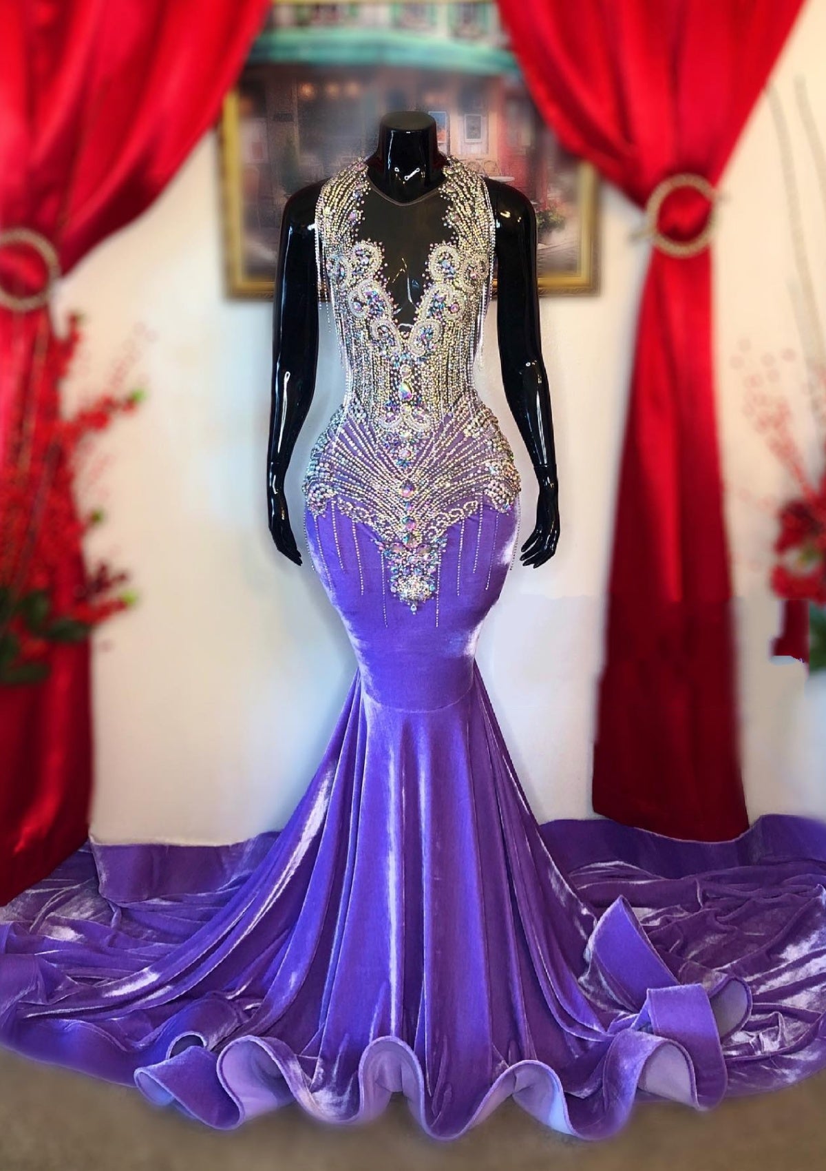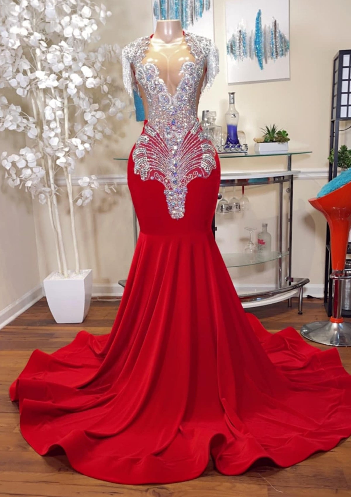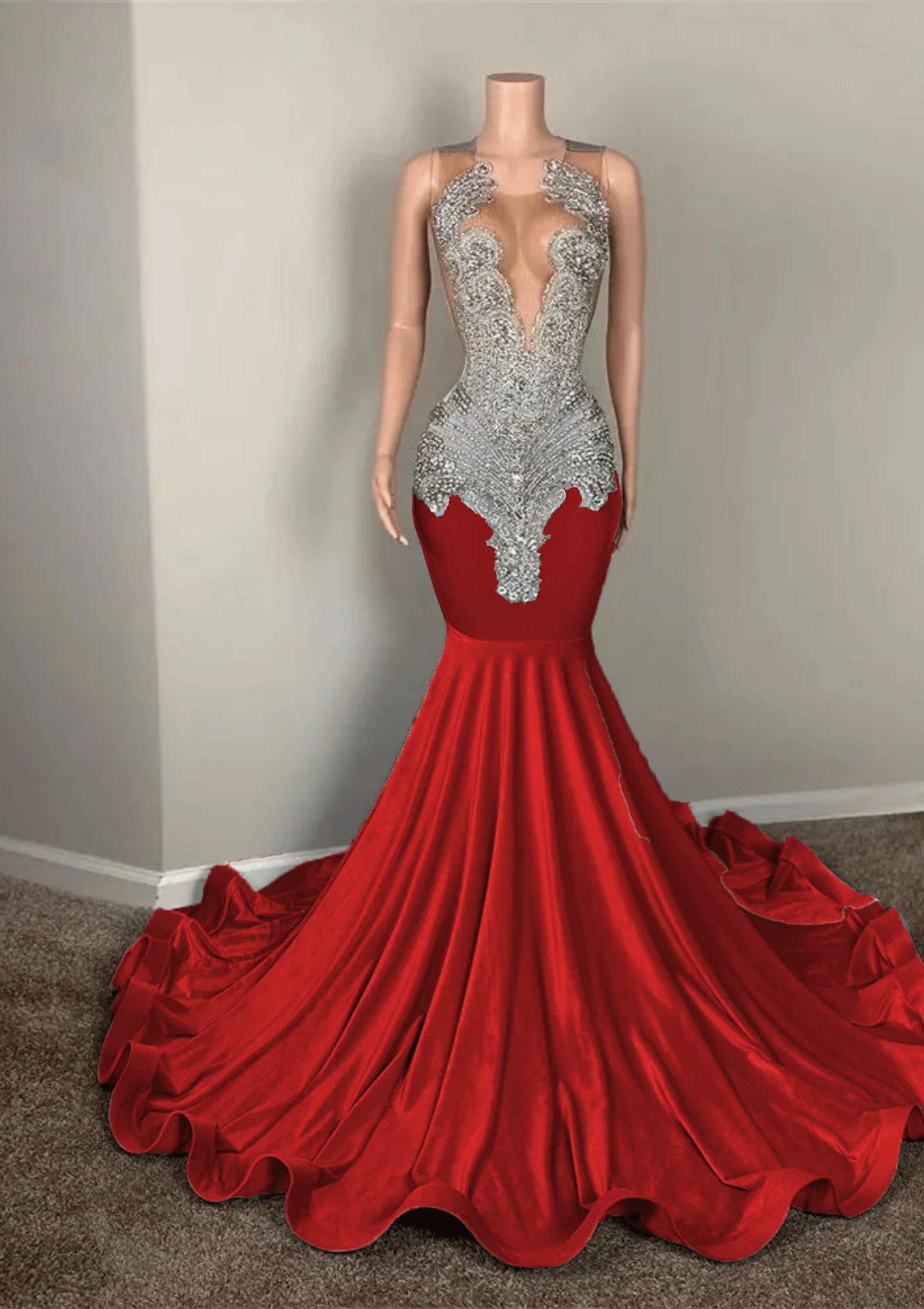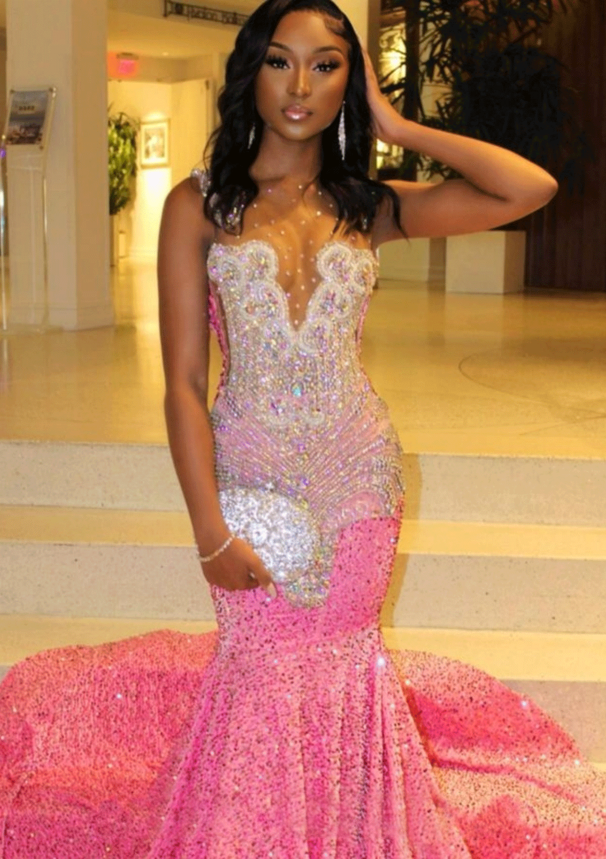 Glamorous Sequined Heavy Rhinestone Prom Dress with Sparkling Long Train