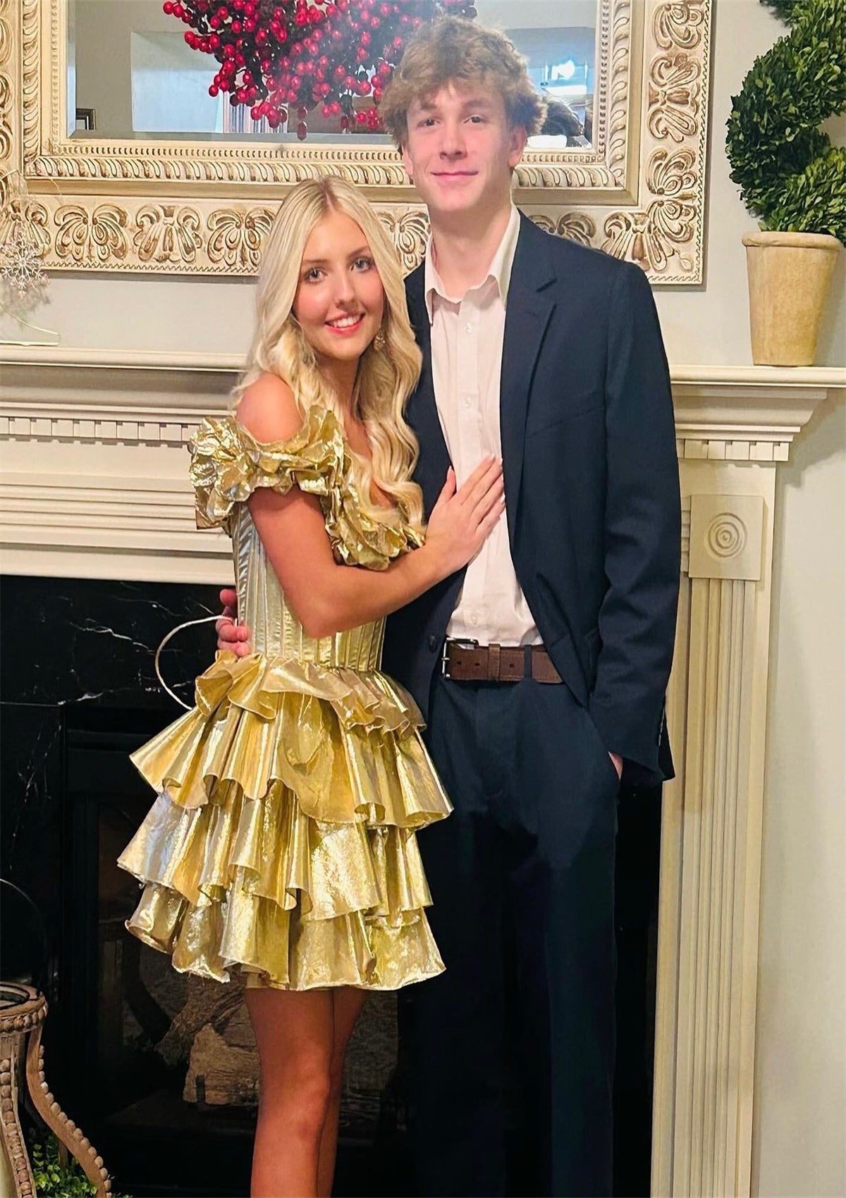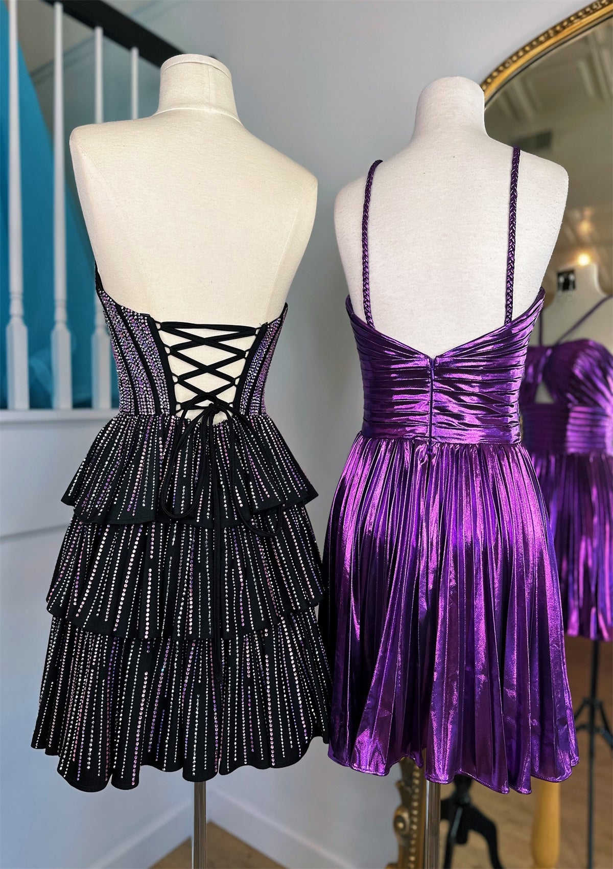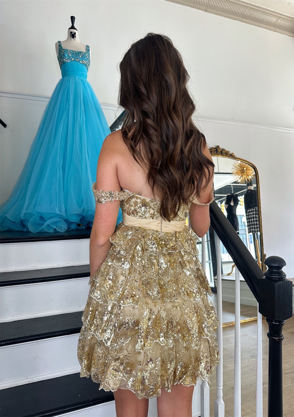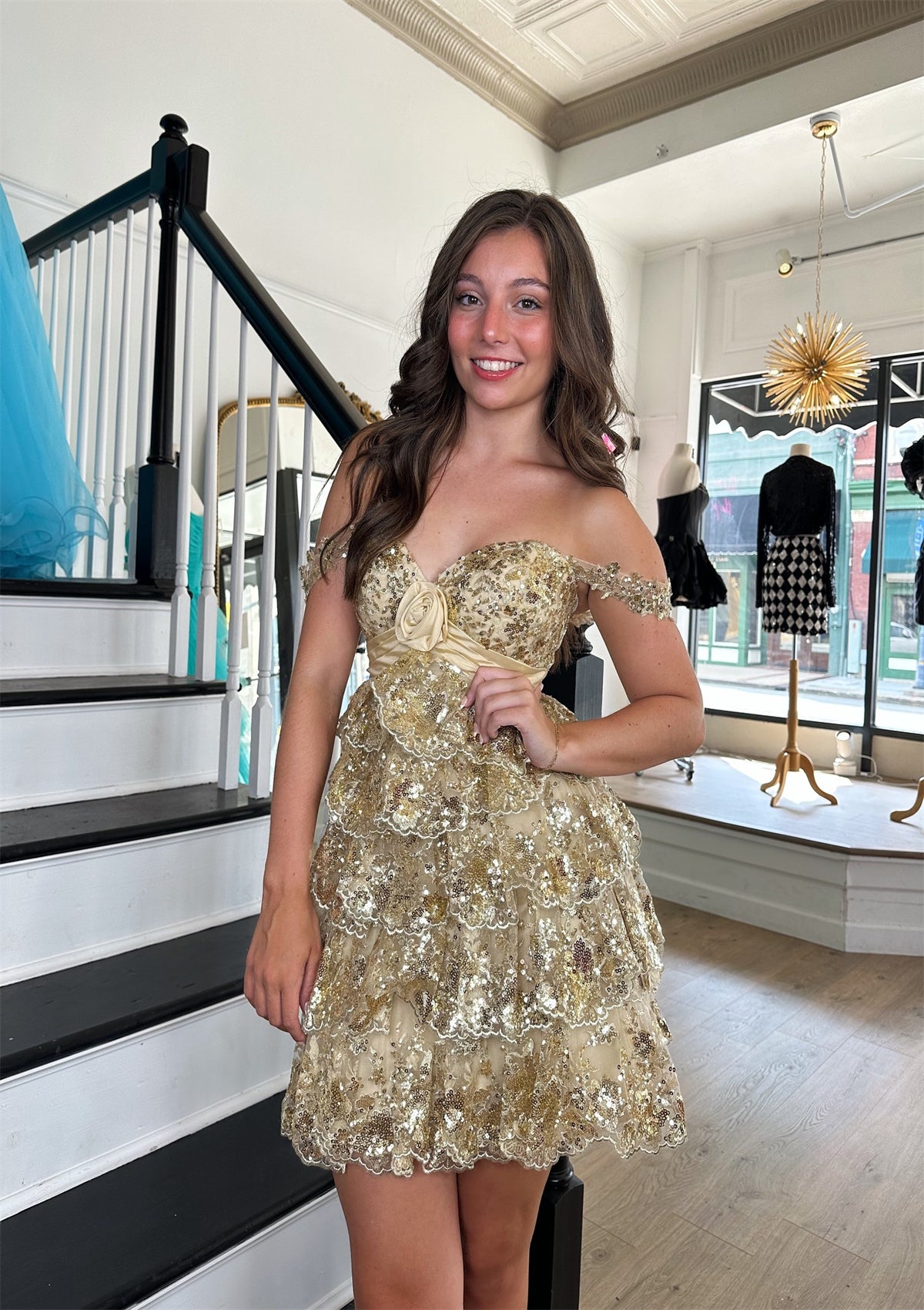 Metallic Off Shoulder Corset Tiered Homecoming Dress