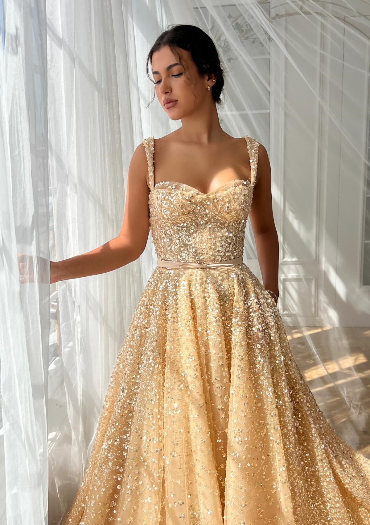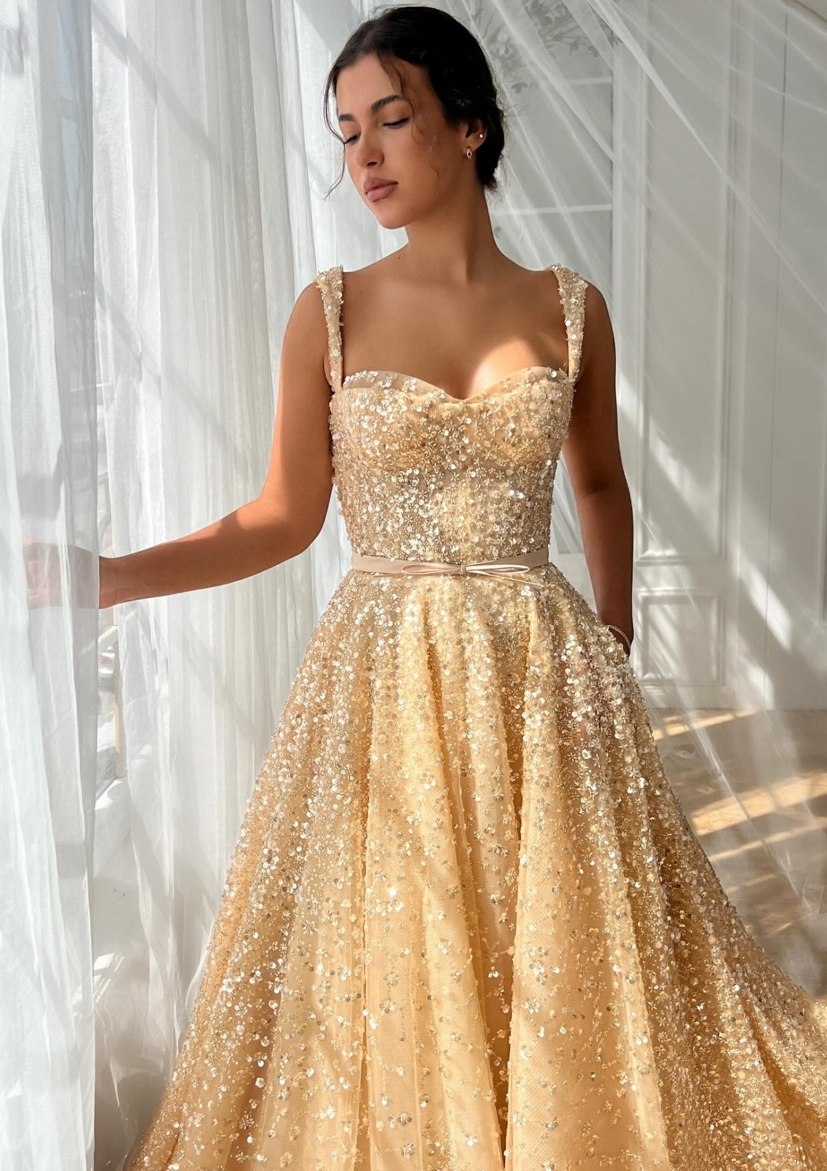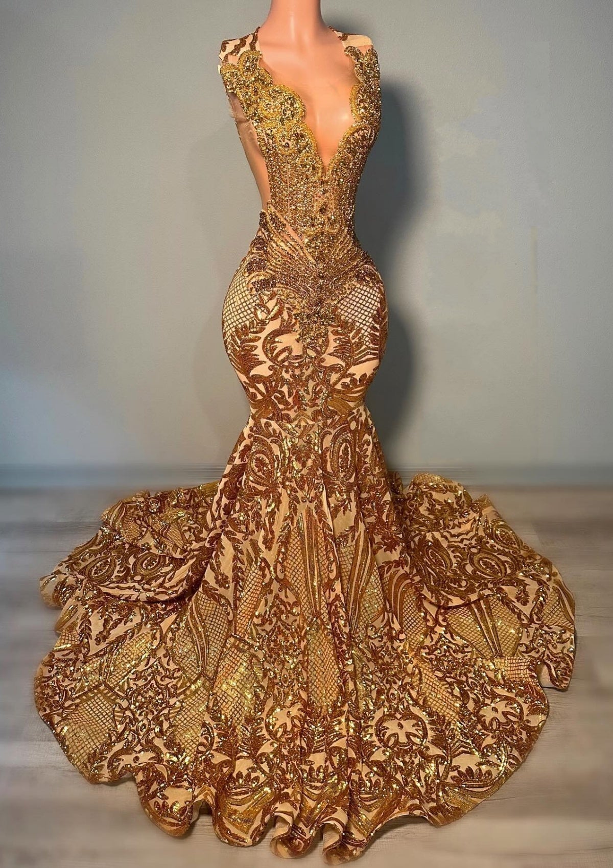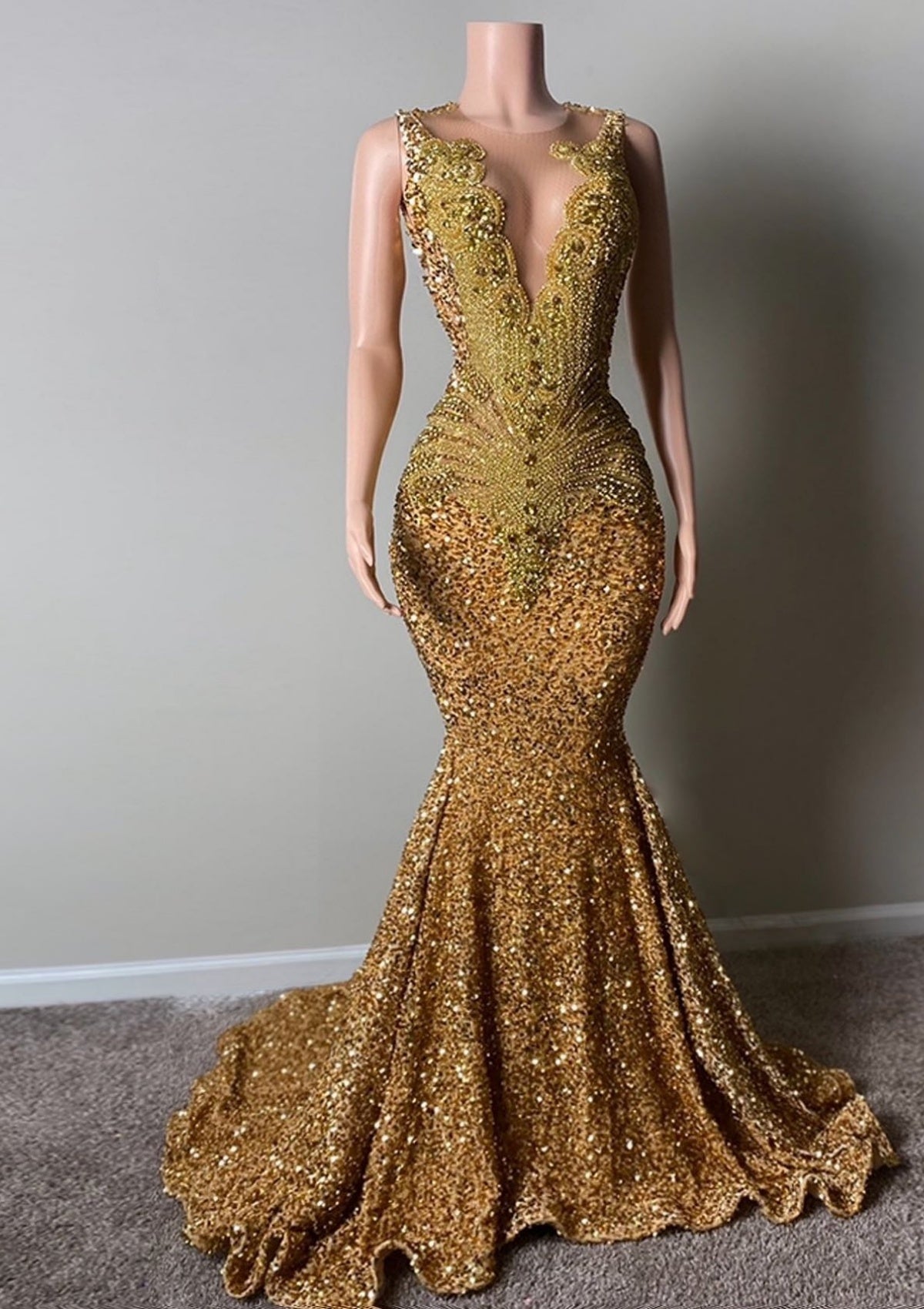 Golden Sequined Mermaid Prom Dress with Intricate Embellished