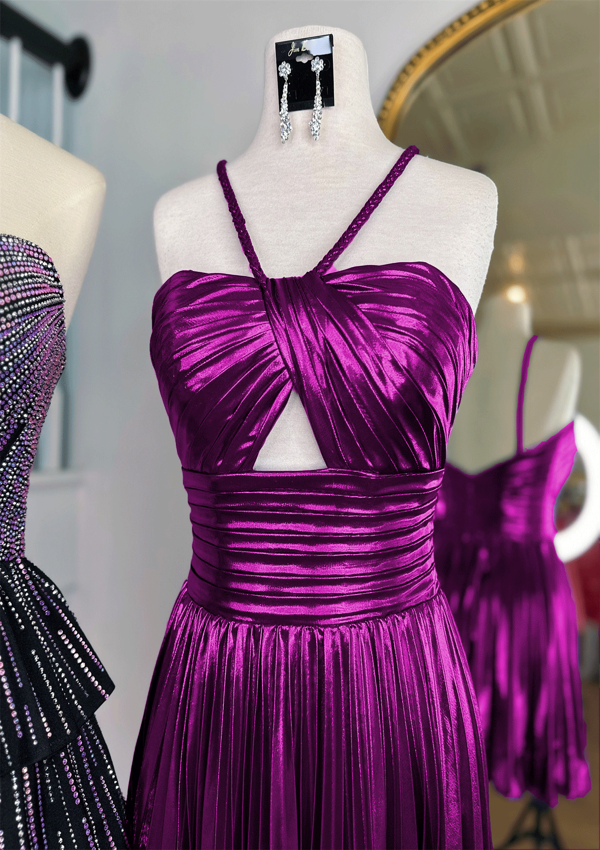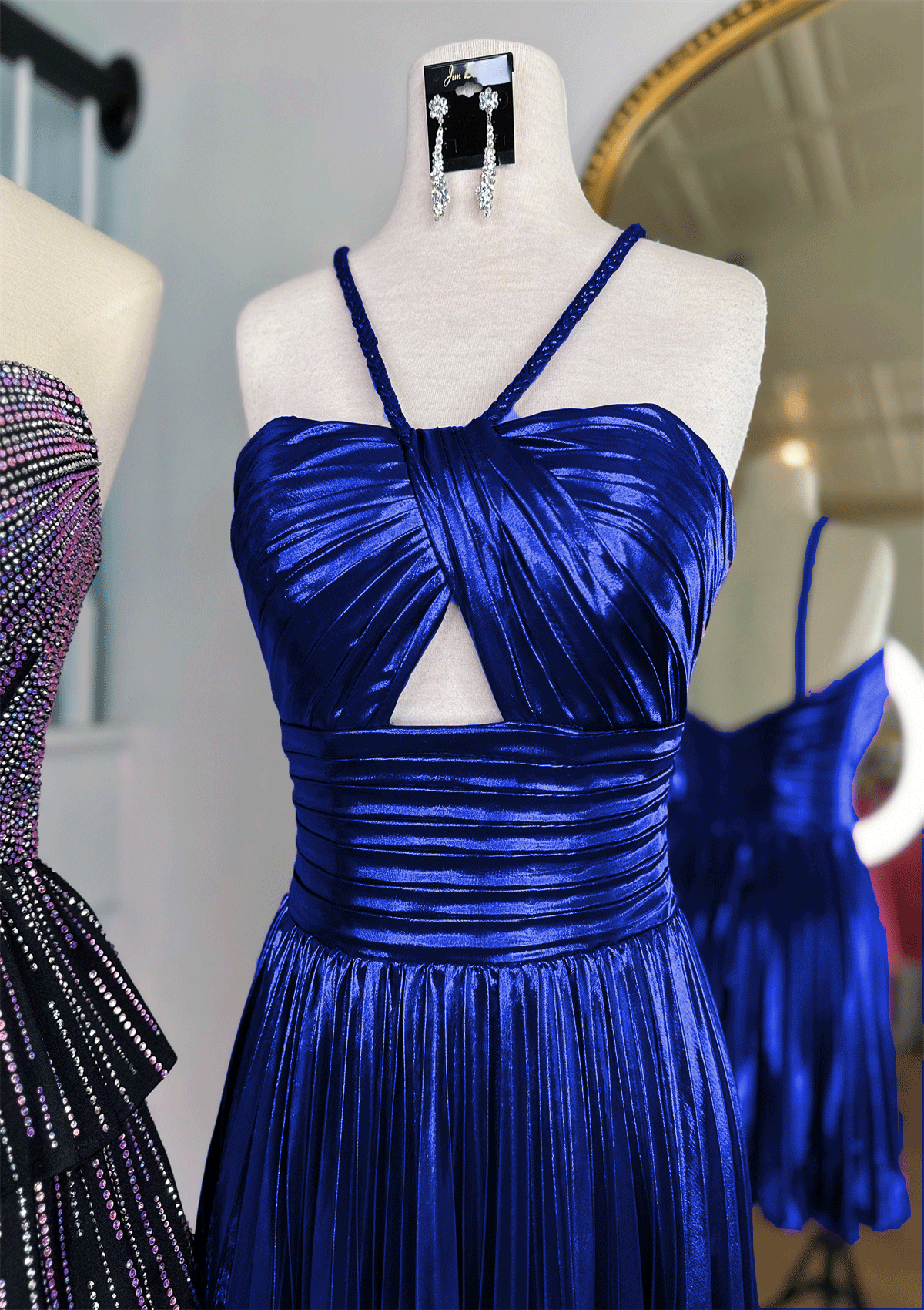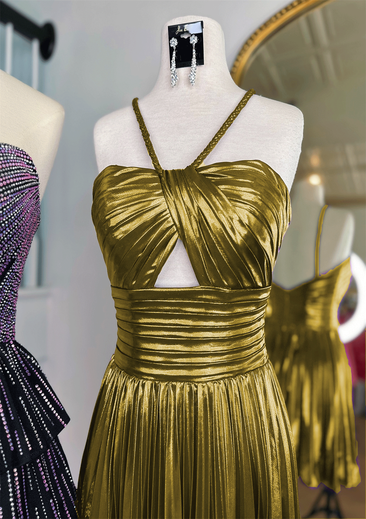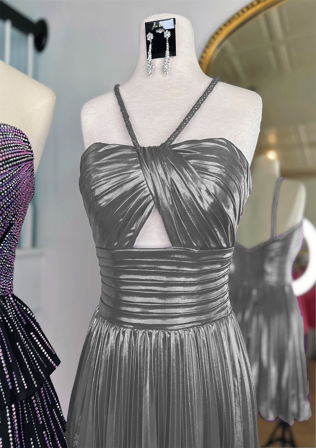 Metallic Halter Cut Out Pleated Homecoming Dress