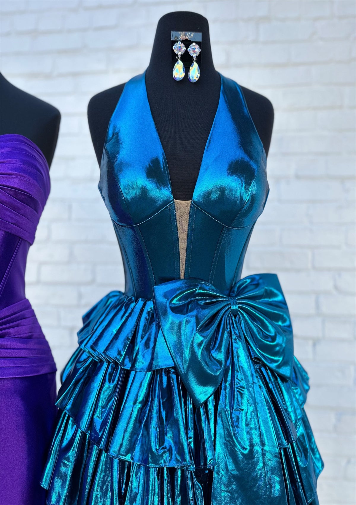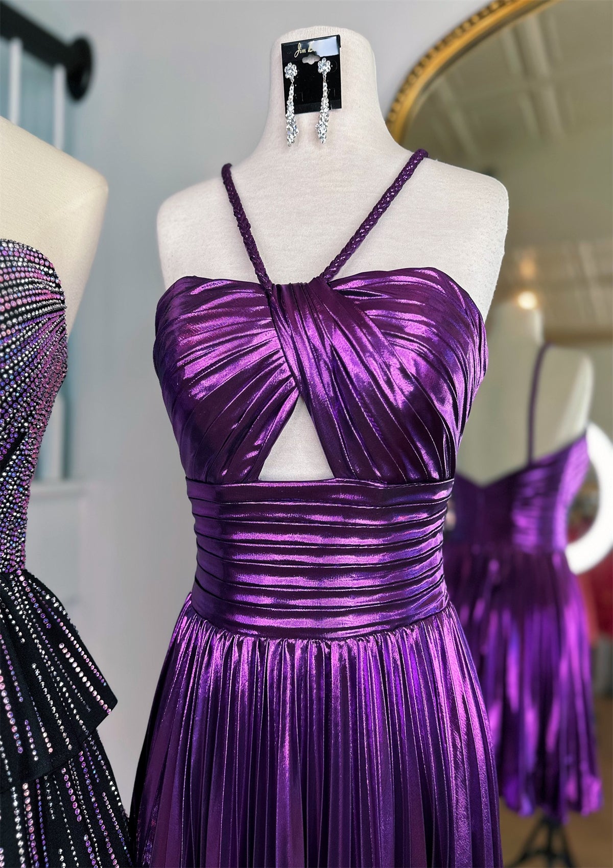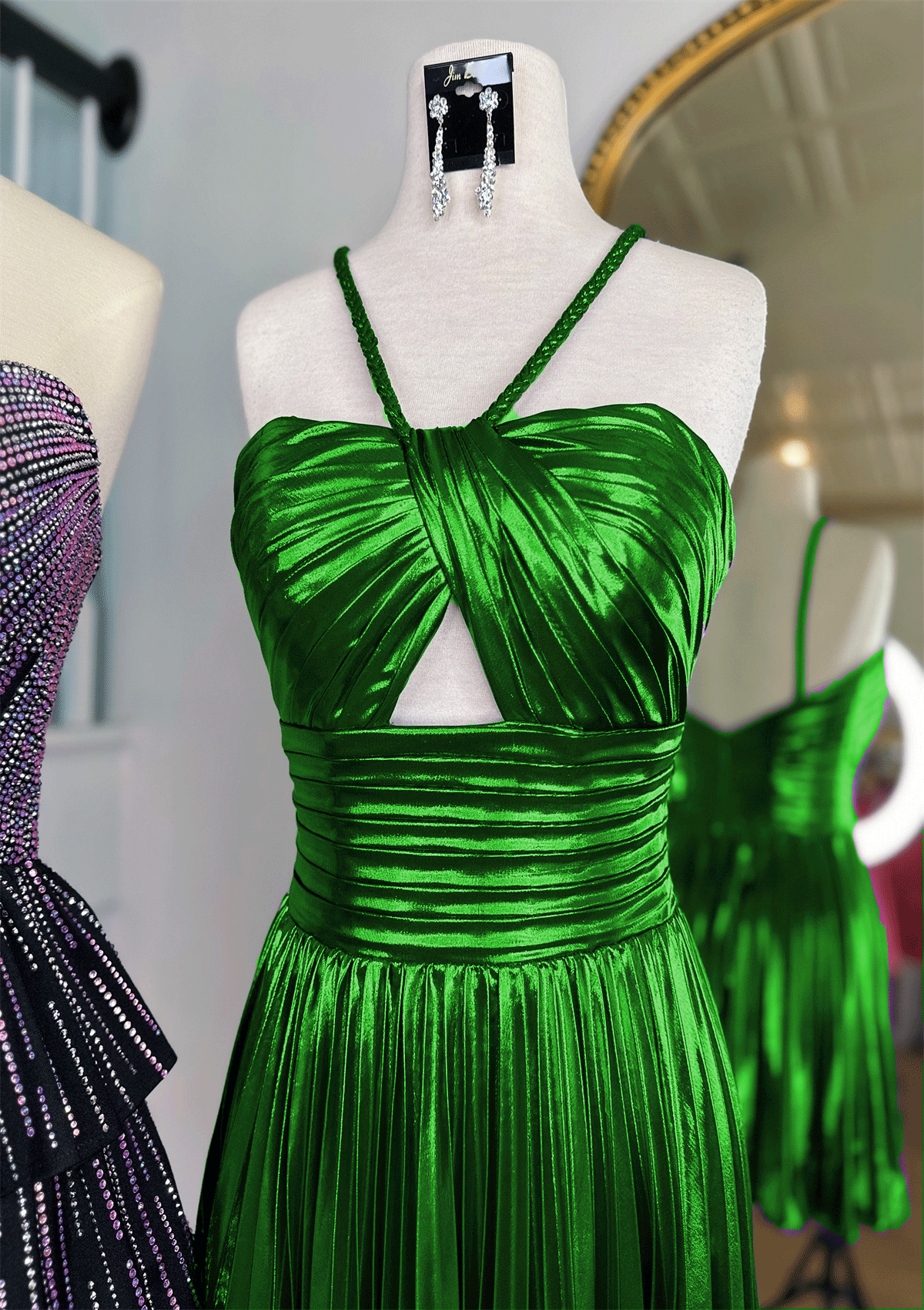 Metallic Halter Cut Out Pleated Homecoming Dress