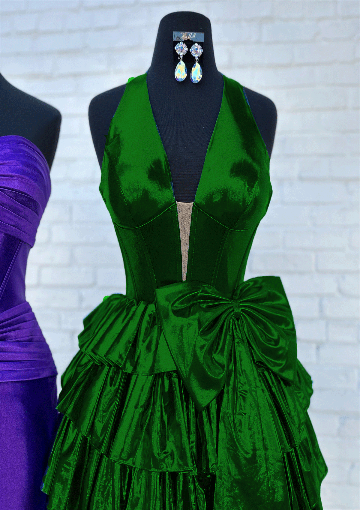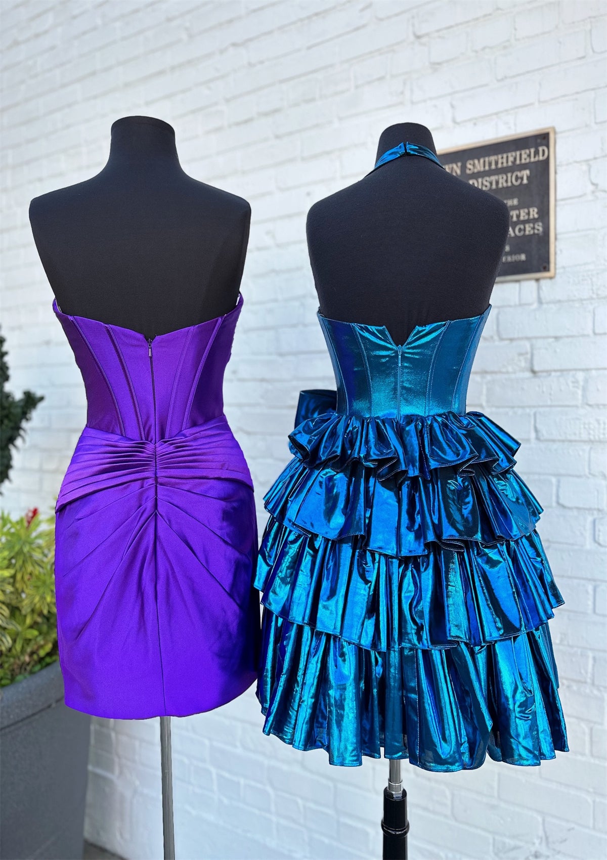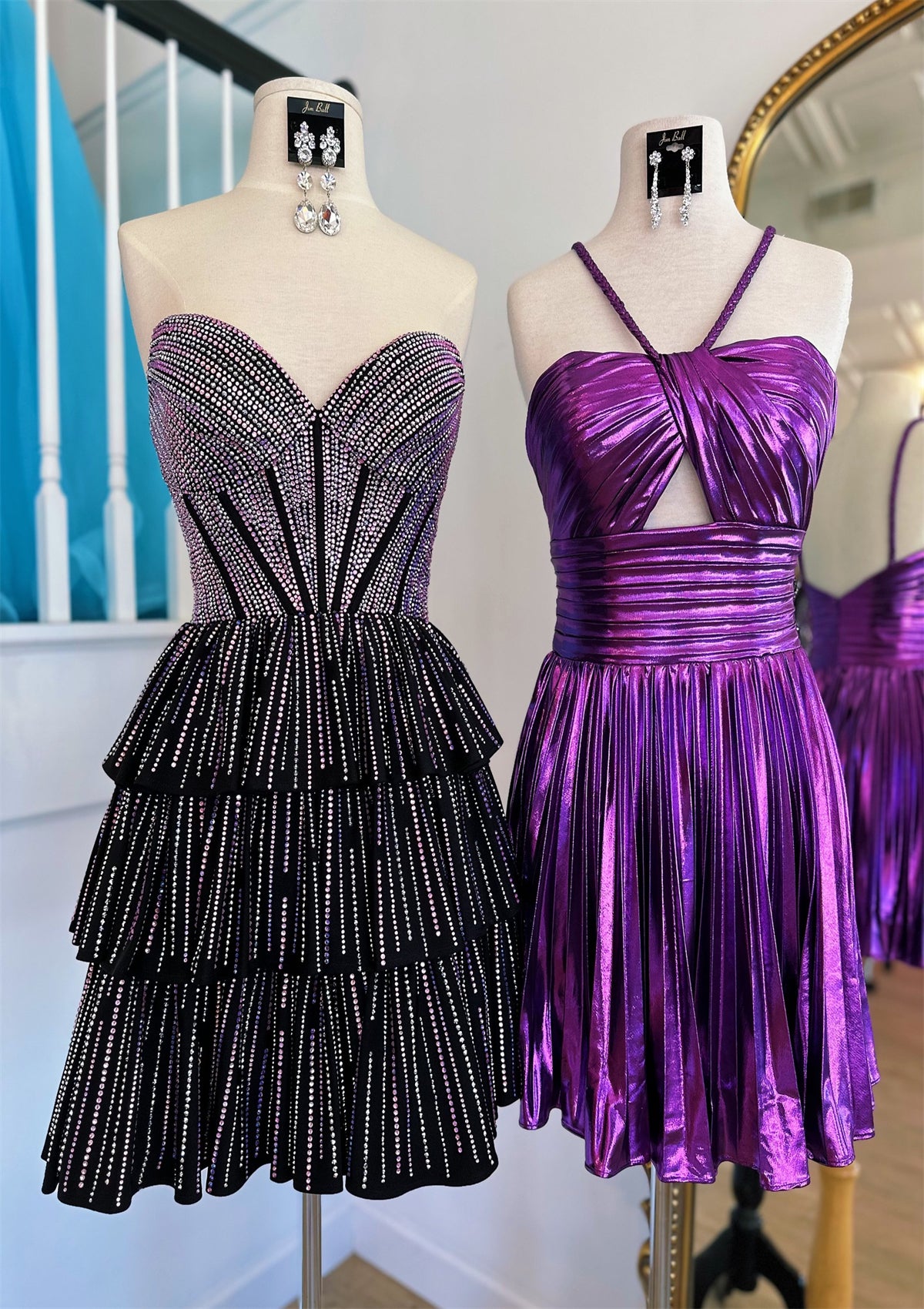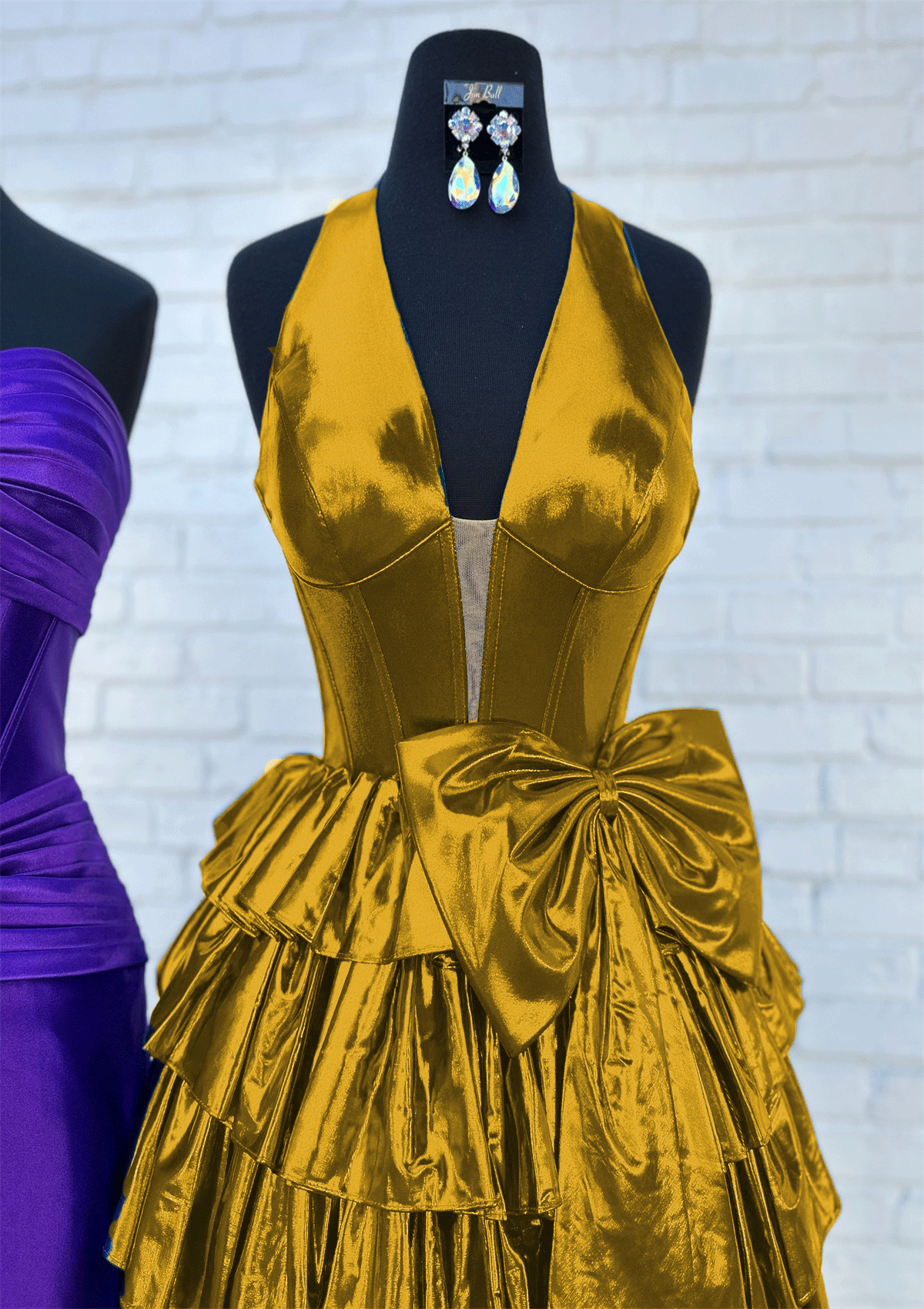 Metallic Halter Cut Out Pleated Homecoming Dress