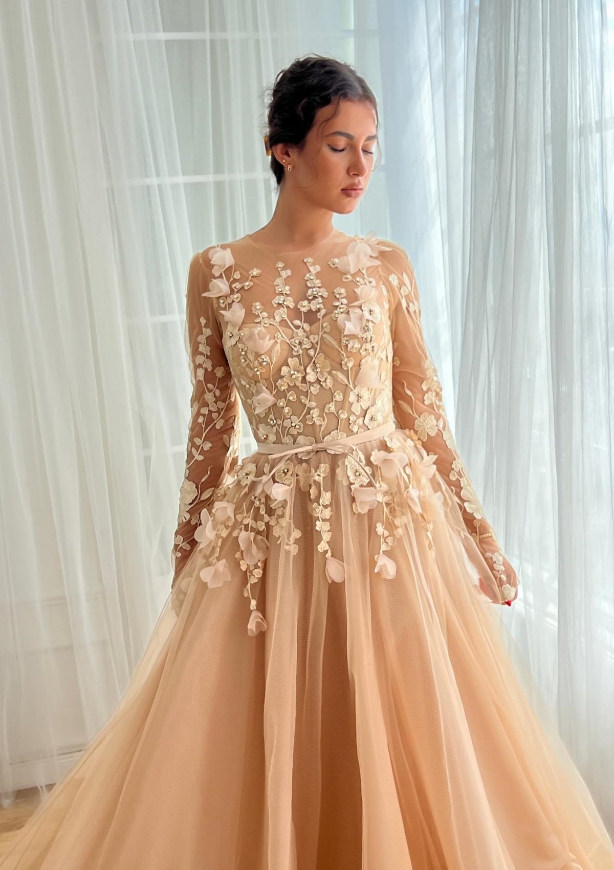 Illusion Scoop Neck Long Sleeves Floral Tulle Evening Dress
