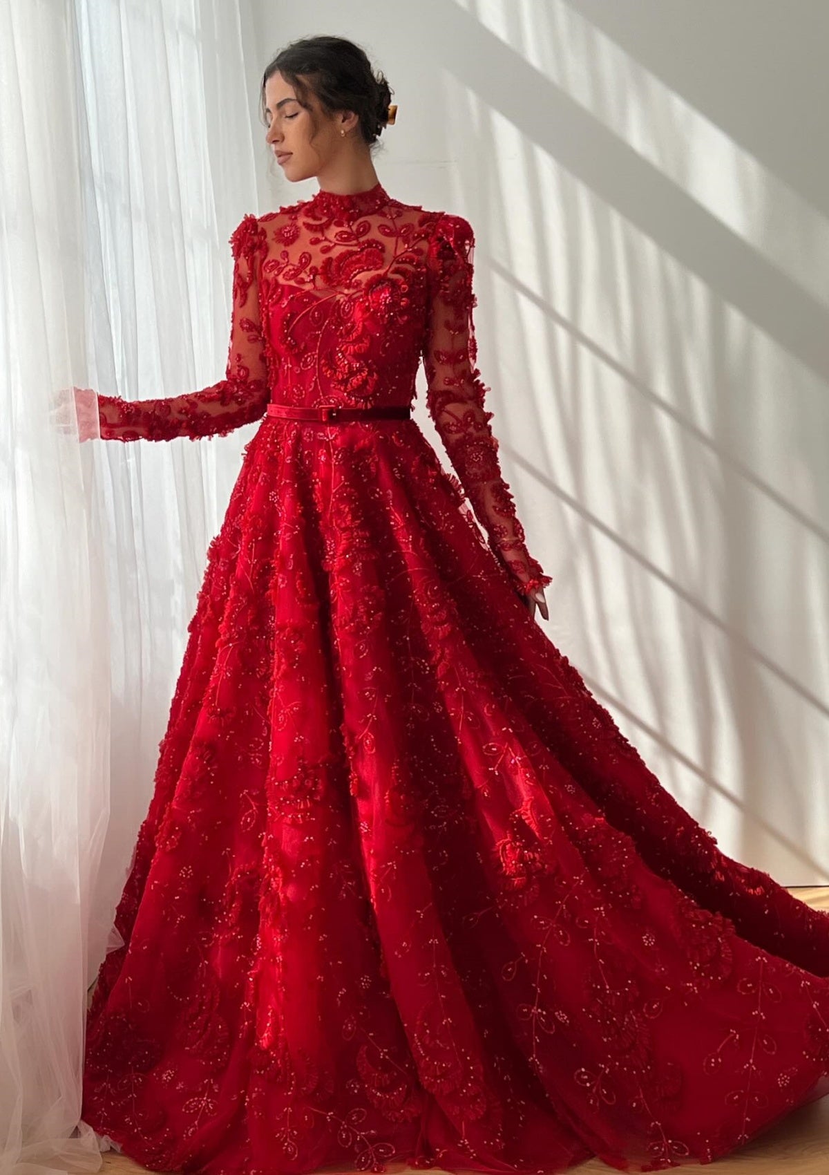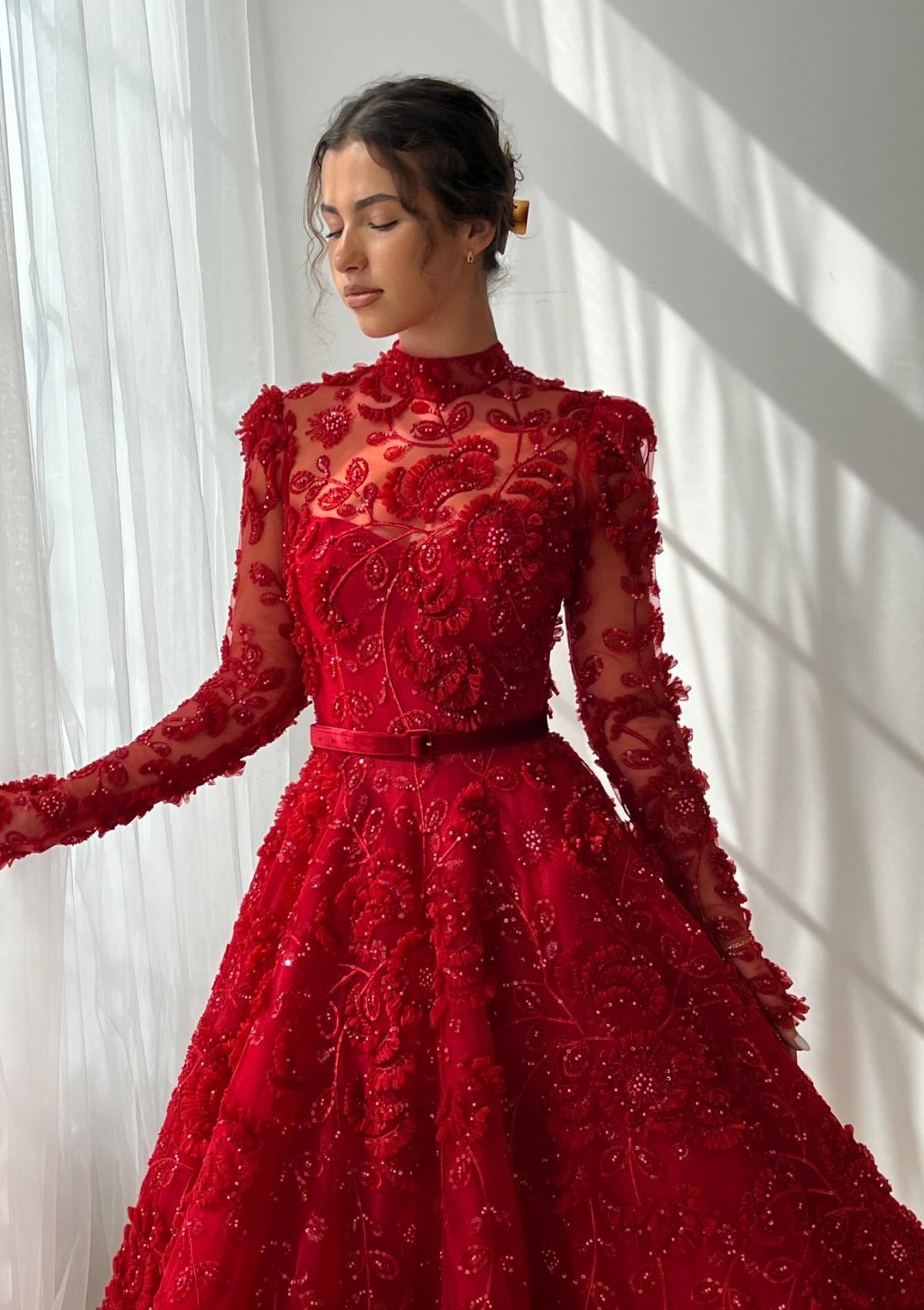 Elegant High Neck Handmade Floral Lace Evening Dress with Sleeves