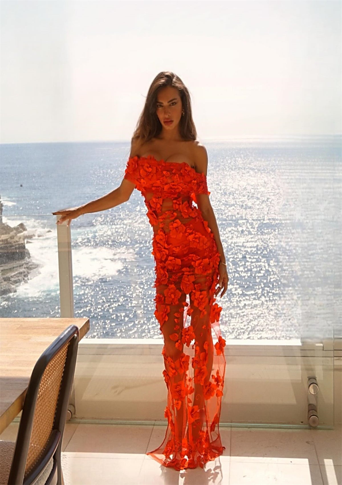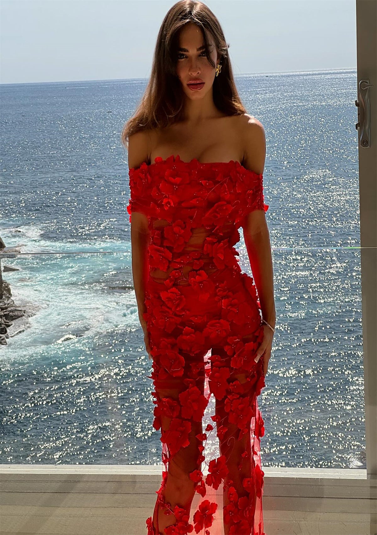 Romantic Red Off-Shoulder Floral Sheer Maxi Evening Dress