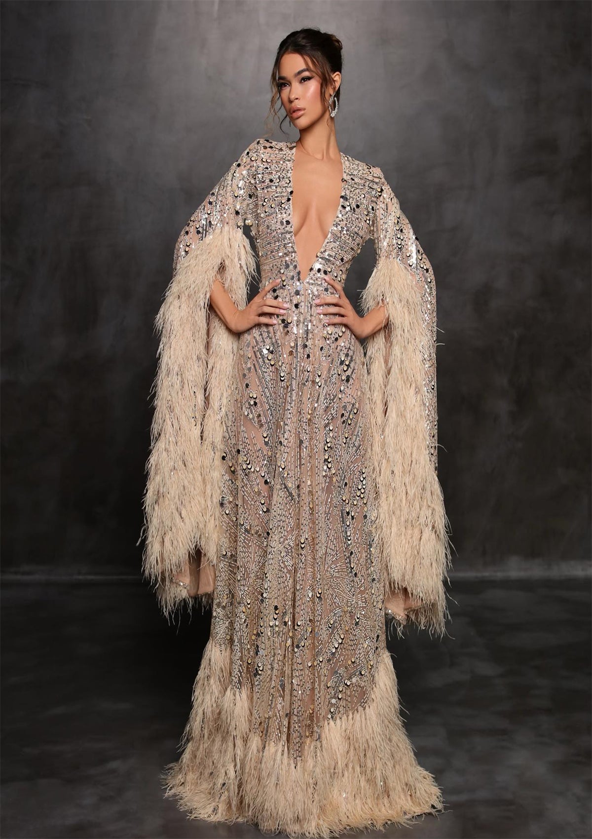 Illusion Plunging Neck Heavy Embellished Bejeweled Prom Dress